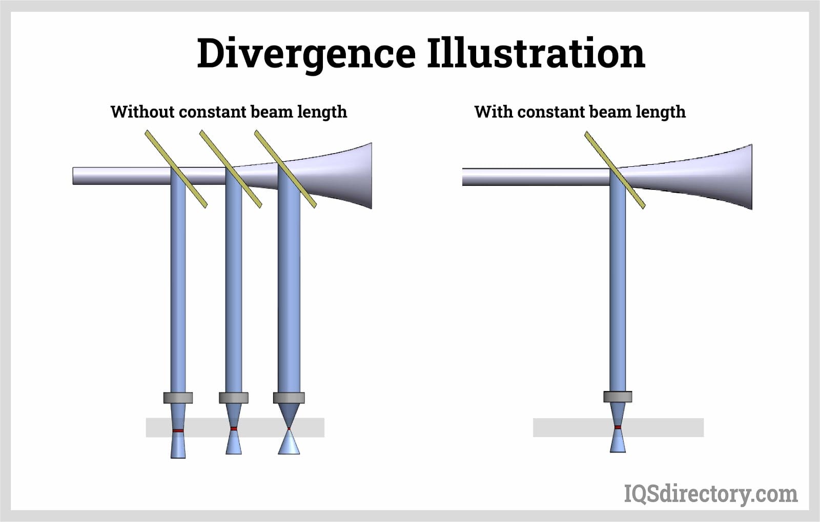 This setup contrasts with the moving material configuration by using a stationary material and a movable laser cutter. As the laser moves continuously, the beam length must be adjusted regularly to compensate for beam divergence, which can affect cut quality. To address this, re-collimating optics and adaptive mirror control are employed. This configuration is the fastest of the three, as controlling the movement of the mirrors is more manageable.