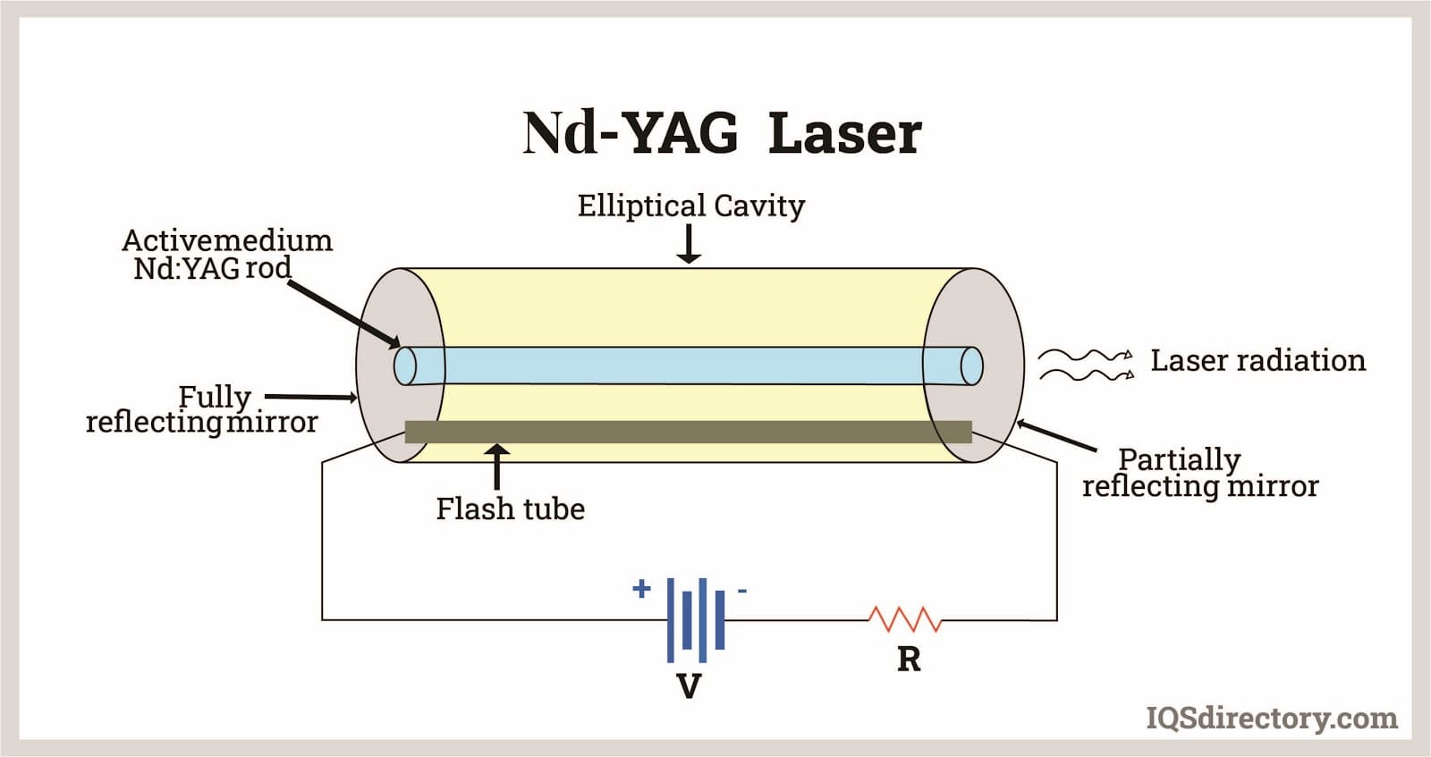 Crystal-based lasers, such as ruby and Nd-YAG lasers, belong to the family of solid-state lasers and offer unique advantages in precision cutting and micro-fabrication. Nd-YAG lasers are particularly valued for their capability to produce high-powered bursts of energy, making them indispensable in welding, drilling, medical surgeries, and precision manufacturing. The Nd-YAG laser utilizes a synthetic YAG (Y₃Al₅O₁₂) crystal doped with 1% ionized neodymium (Nd³⁺), where Nd ions substitute for Y ions. The laser rod measures about 4 inches (10 cm) in length and 2.4 to 3.5 inches (6 to 9 cm) in diameter. Both ends are polished and coated for maximum reflectivity, serving as the resonator system required for efficient photon amplification.