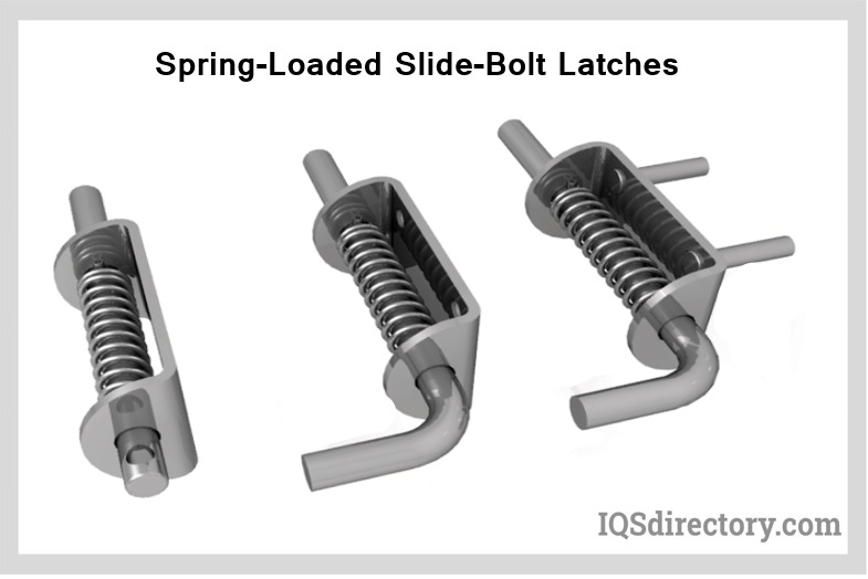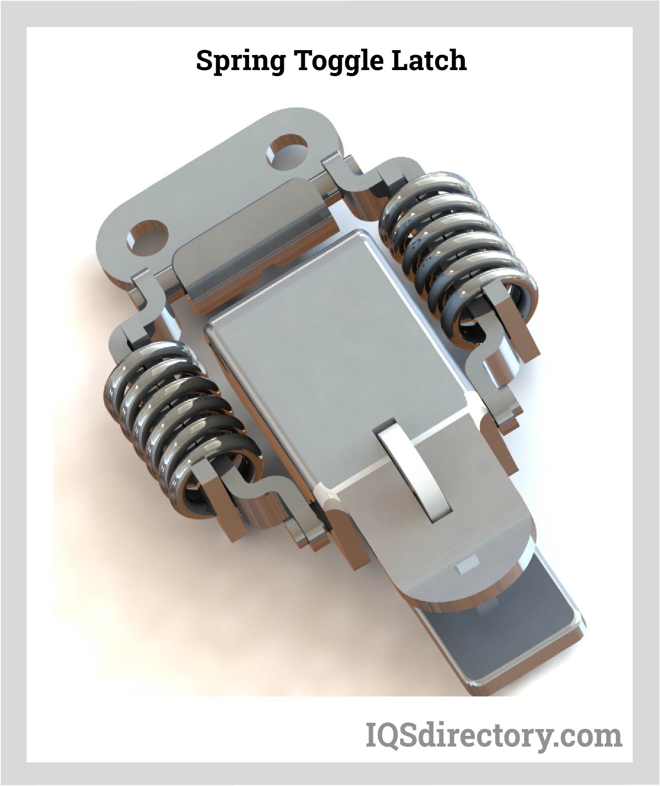 Spring latches include toggle, slide-bolt, safety, pull-release, chain-grip, and draw latches. They are chosen for securing doors, cabinets, machine panels, storage compartments, and applications needing vibration resistance or rapid access.
