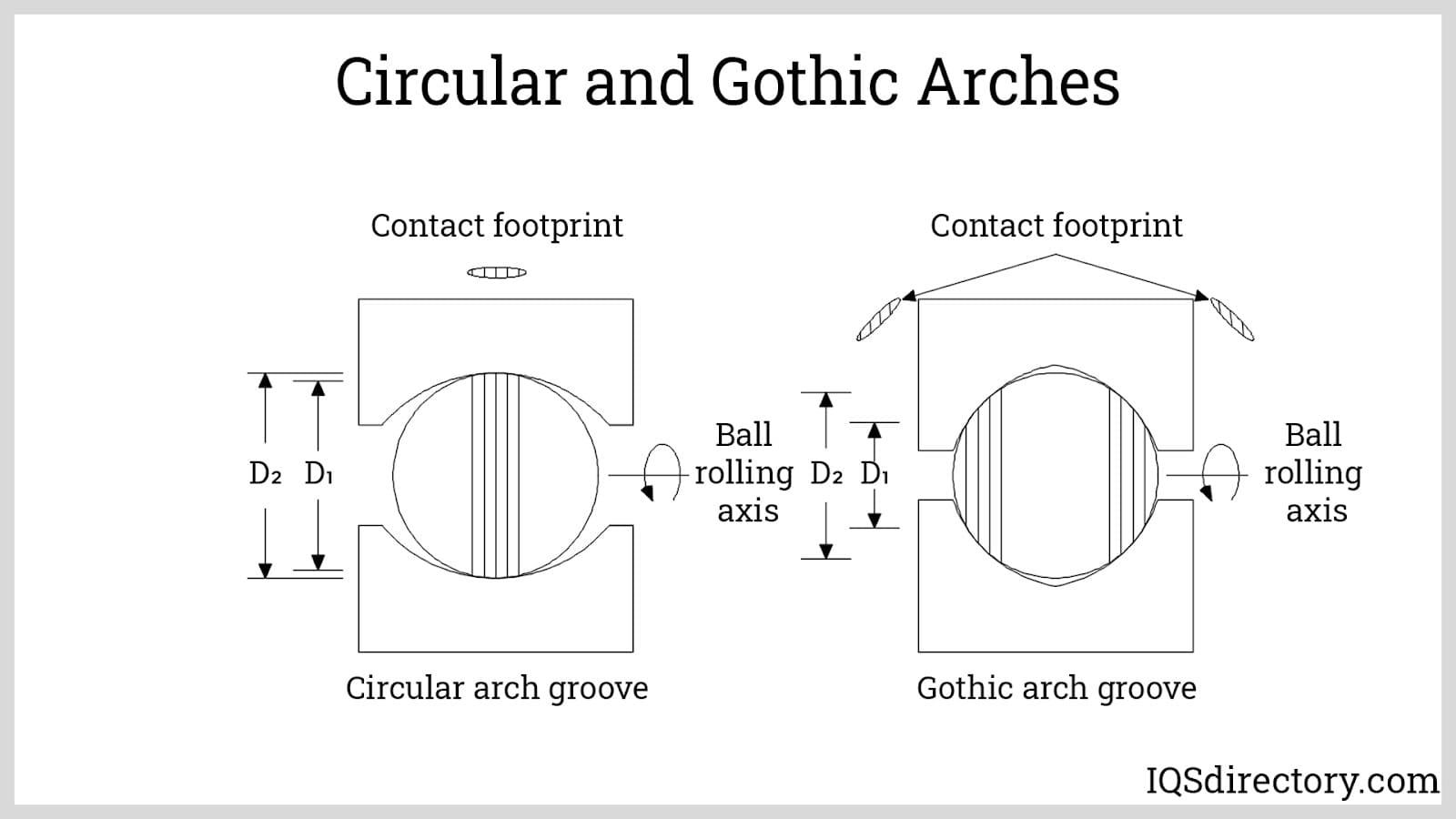 Balls in circular arches contact the race at two points, while gothic arches contact at four. Although gothic arches provide enhanced load capacity, they may incur differential slip from variable rolling diameters, increasing friction. Circular arches are generally preferred, but gothic arches serve small systems needing higher load capacities.