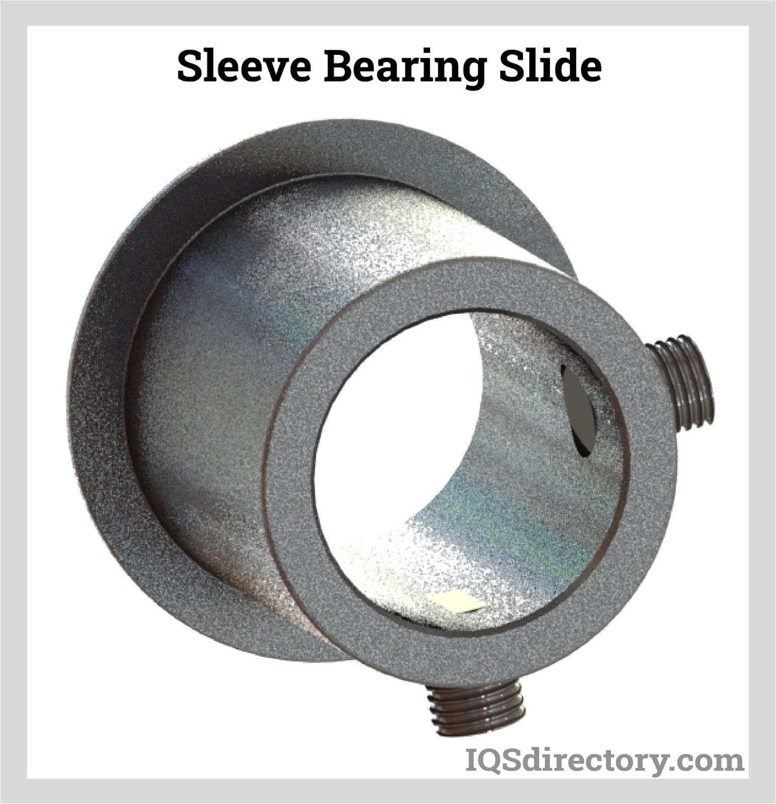 Sleeve bearing linear slides, sometimes called plain bearing slides, employ cylindrical surfaces (bushings and journals) rather than interlocking mechanical shapes. The bushing, a hollow cylindrical component embedded in the carriage, slides over the journal—a solid shaft mounted on the base to serve as a guide rail.