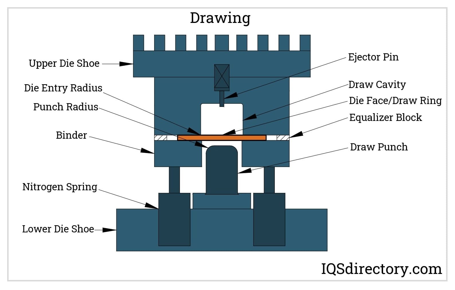 Drawing is a precision metal forming process that forces the workpiece material to flow radially while retaining nearly the same surface area. The drawn shape adopts the contour of a die, allowing the transformation of flat sheet metal into cylindrical, box-like, or complex hollow components. Drawing preserves material thickness and provides high strength-to-weight ratios, making it indispensable for manufacturing deep-drawn parts such as beverage cans, sinks, and automotive housings.
