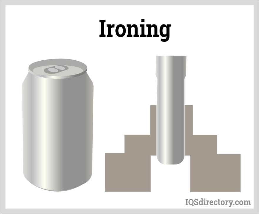 Ironing is similar to coining but is specifically utilized to reduce and standardize wall thickness in cylindrical metal parts, such as cans and battery sleeves. By squeezing the part beyond its original thickness—commonly to 30%—ironing ensures uniform, thin walls and increases the vessel's overall length. Manufacturers use ironing in combination with deep drawing for producing lightweight, robust, and seamless containers in high-speed production environments.