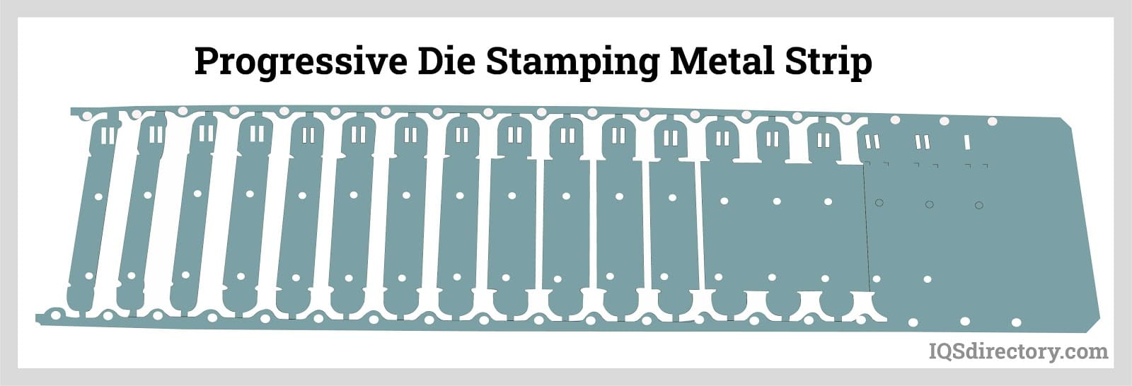 Progressive die stamping is acclaimed for its high automation, productivity, and consistency in producing complex, precision metal parts at scale. In a progressive die set, a continuous strip of metal is fed through a series of stamping stations. Each die in the sequence performs specific operations such as punching, coining, bending, or blanking. The stress applied is distributed evenly over several operations, resulting in precise tolerances and excellent part repeatability. The even spacing of operations is called the progression. Progressive dies are widely used in high-volume production of automotive and electronic components, hardware, and consumer products due to their speed and low per-part cost.