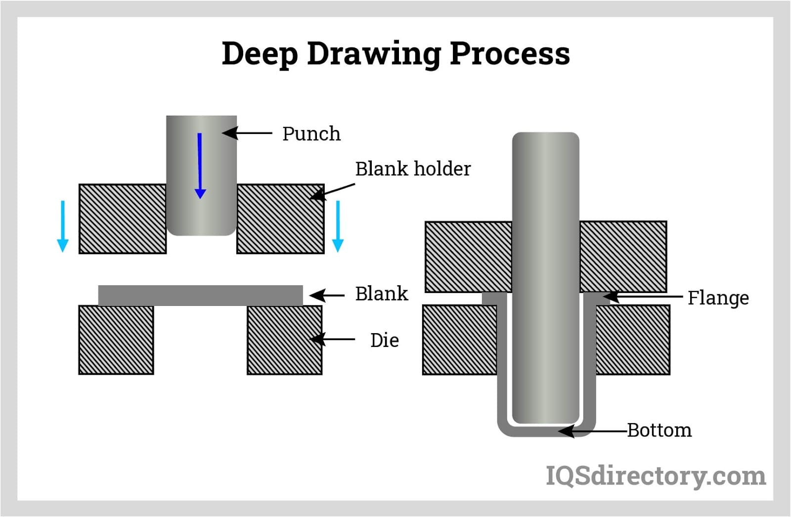 The deep draw process enables shaping into various forms, such as shell, cup, square, rectangle, or cylinder. It starts with moving a flat metal sheet or blank onto the die for shaping.