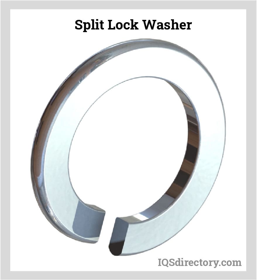 Split – A split lock washer is formed in the same way as a flat washer with a hole in the center and a metal ring. The variation in a split washer is a slit that has been made in the ring that causes the metal to take the form of a spring with one section above and the other below. The appearance of split washers as a spring has given them the name helical washers.
