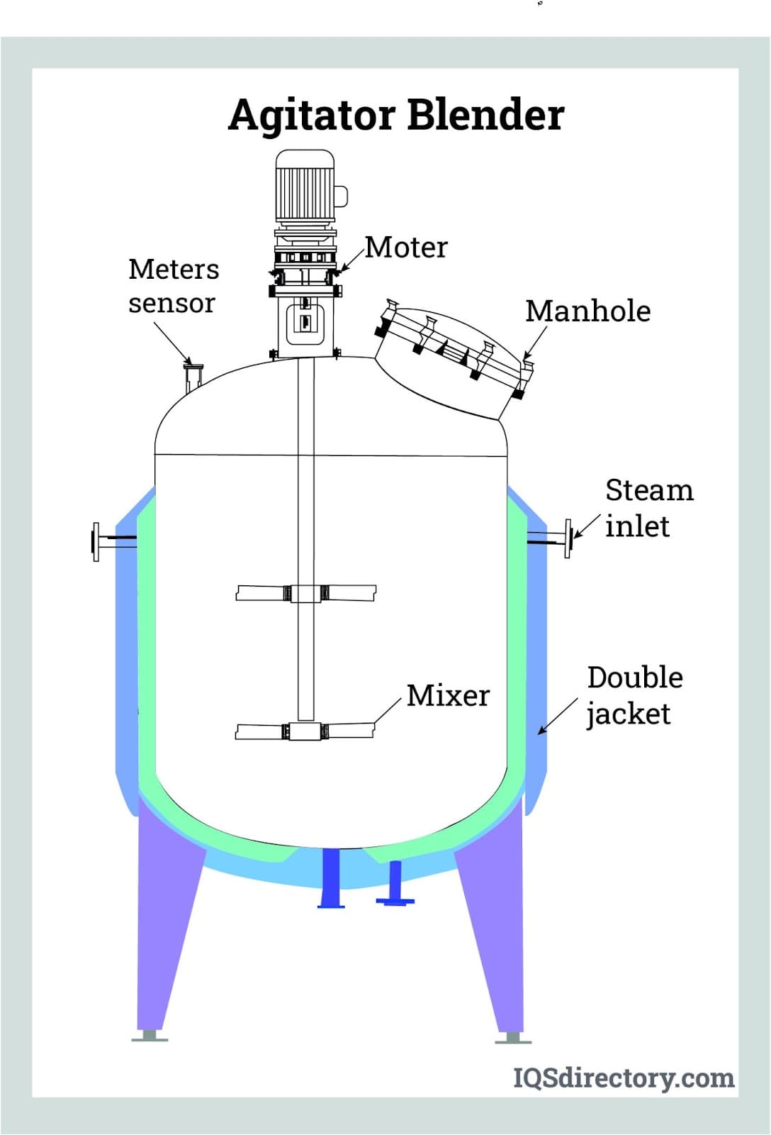 Agitator industrial blenders offer continuous mixing for liquids through constant motion. This method relies on non-specific movements to blend materials, using rotating paddles or impellers for fluid agitation. While they are primarily designed for low-viscosity materials, such as liquid solutions or light slurries, they can be adapted with sturdier paddles or upgraded motor power to handle high-viscosity substances and more demanding industrial mixing processes effectively. Agitator blenders are commonly found in food processing, beverage, paint, and chemical manufacturing environments where uniform liquid mixing is required.