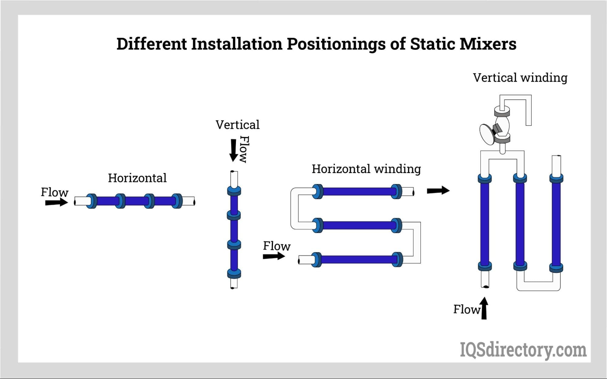 Static mixers can be installed horizontally, vertically, on an angle, or any other type of configuration since they do not have any moving parts and do not require any form of power supply. As with other factors that govern the use of static mixers, their positioning is in regard to the type of fluids or gasses that will be mixed.