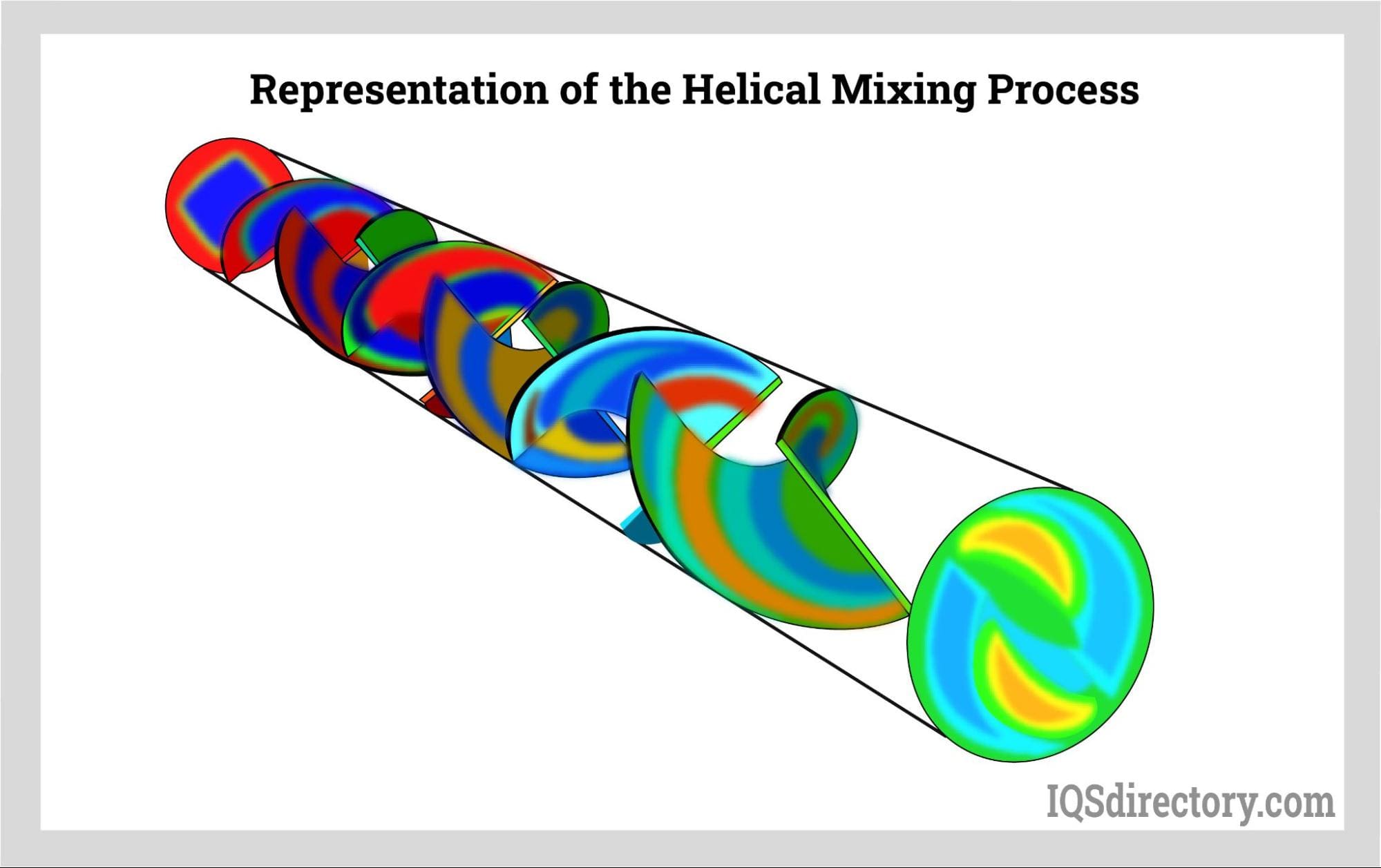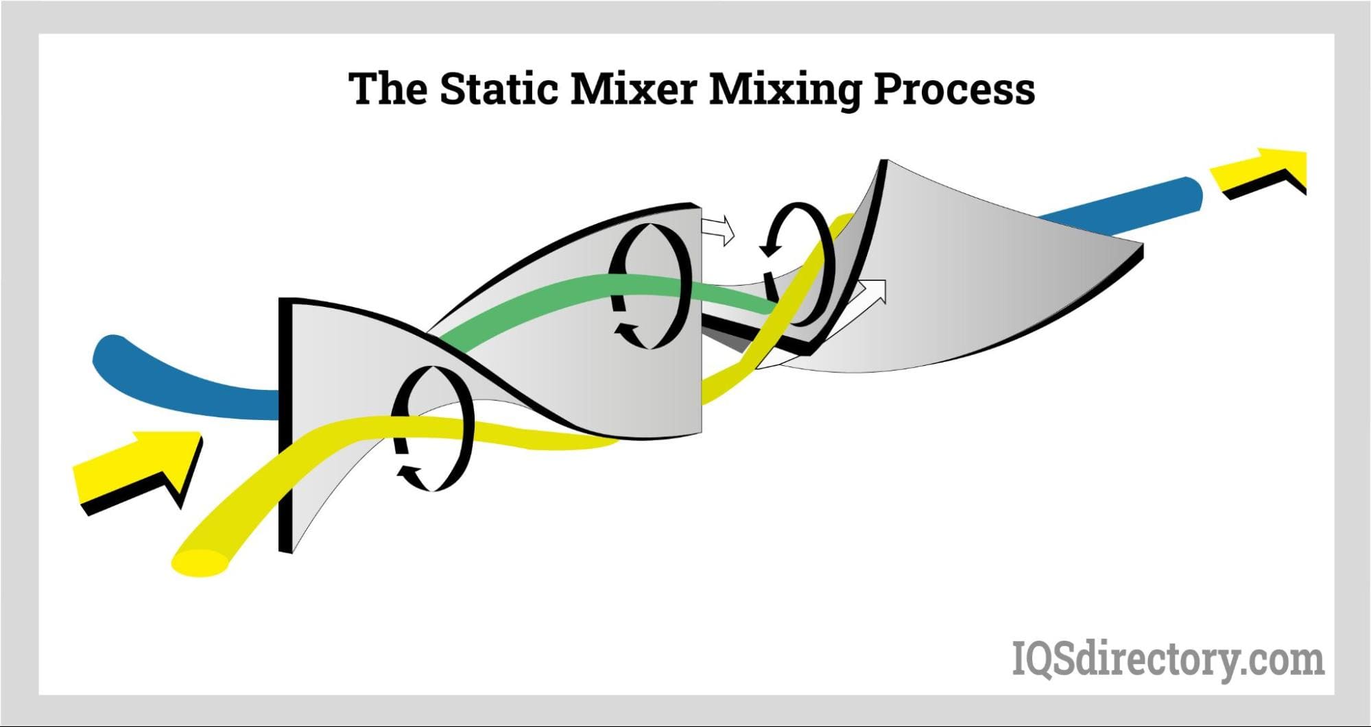 Static mixers have no moving parts and rely on the placement of the various types of mixing elements to blend and mix liquids, fluids, and gasses that pass through the mixer. The placement of the mixing elements causes the material flow to move in certain ways to initiate the mixing process. For turbulent flow patterns, the mixing process is splitting and radial while the process for a laminar flow is splitting.