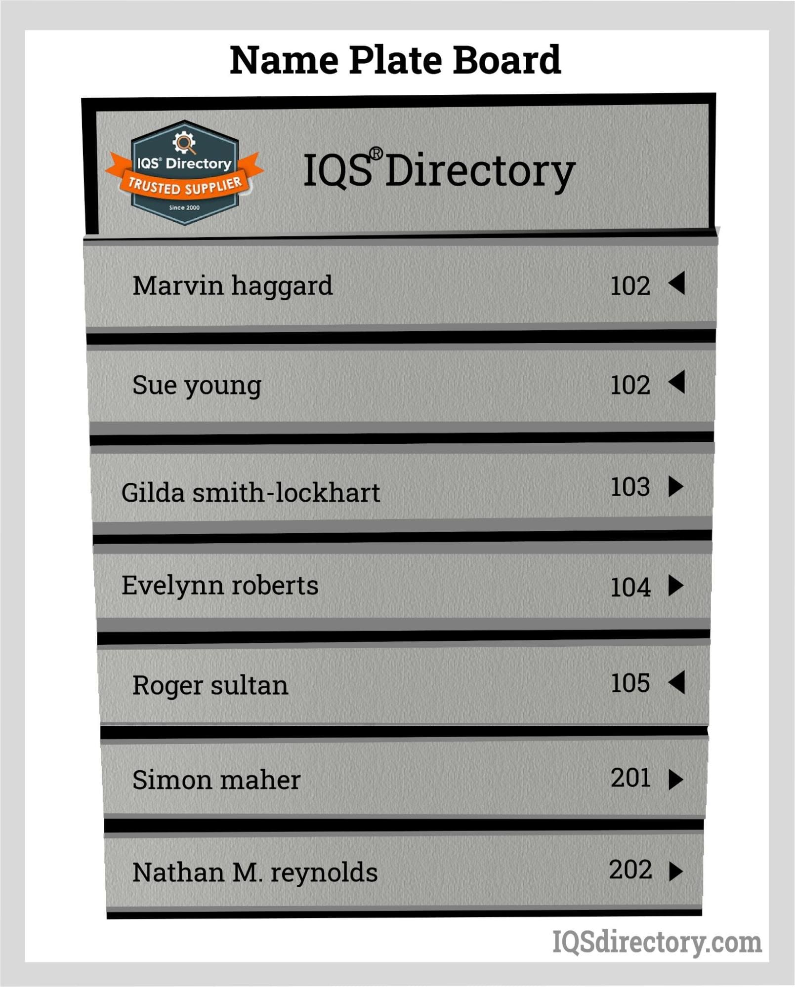 Office nameplates vary in form based on the individual's role, location, material, and significance. In banks, financial institutions, insurance offices, and other public spaces, desk nameplates are common to help customers identify staff. In medical offices, industrial complexes, and large corporate environments, nameplate boards are used to designate individuals and their locations within the building. Key members of an organization may have multiple nameplates, including those for their office door, desk, and the building's nameplate board.