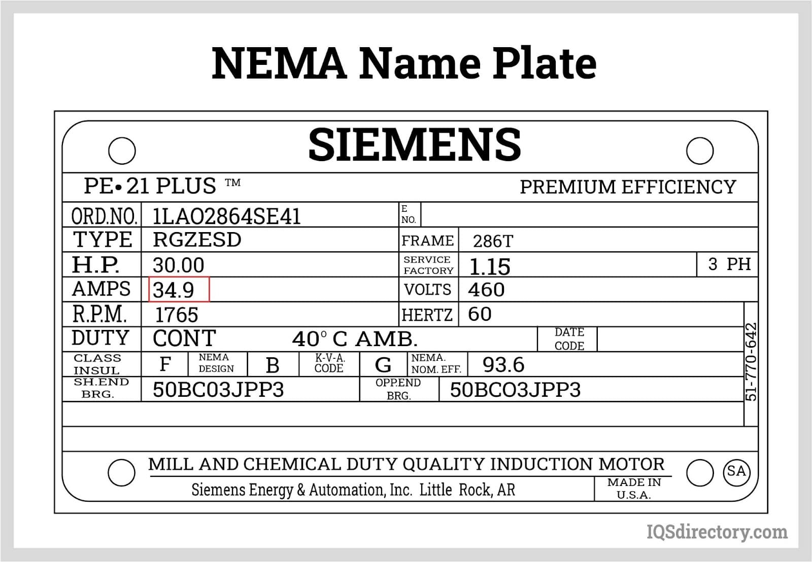 When a motor is constructed to meet National Electrical Manufacturers Association (NEMA) standards, its nameplate features universal codes and technical details specifying the motor’s characteristics. These include code identification, design, insulation class, and other essential operational parameters required for installation and maintenance. A NEMA-compliant motor nameplate typically includes: