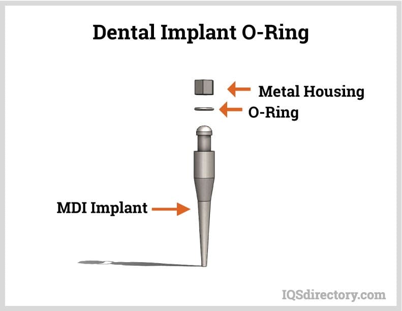 In dentistry, silicone O-rings are used for securing dental implants. The O-ring fits over a ball that holds the implant in place, with precise sizing required for a secure fit. Unlike past methods involving paste or glue, modern implants use a permanently placed ball to retain the implant. Silicone O-rings act as buffers, preventing irritation by ensuring the implant does not rub against the gum.