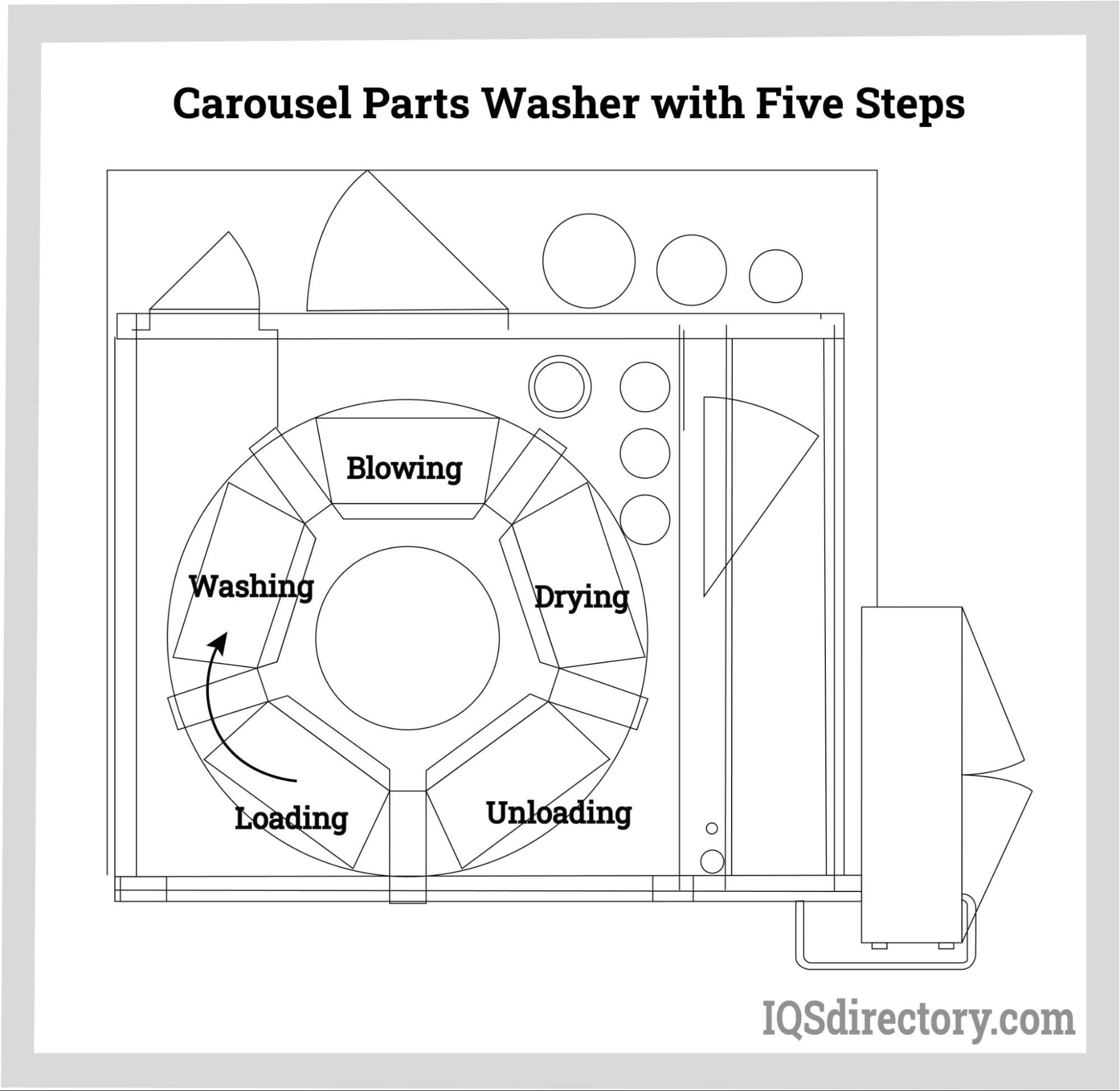 Carousel parts washers operate on a design similar to a rotating barrel. The open side of the barrel allows for easy loading of parts, while the interior features a rotating carousel that moves parts through each step of the cleaning process. Depending on the design, the carousel may include anywhere from 3 to 16 steps, each indexed to ensure sequential processing for optimal cleaning and drying. Users can adjust the rotation speed, timing, number of steps, and treatment durations to tailor the system to the specific cleaning requirements of the parts being processed.