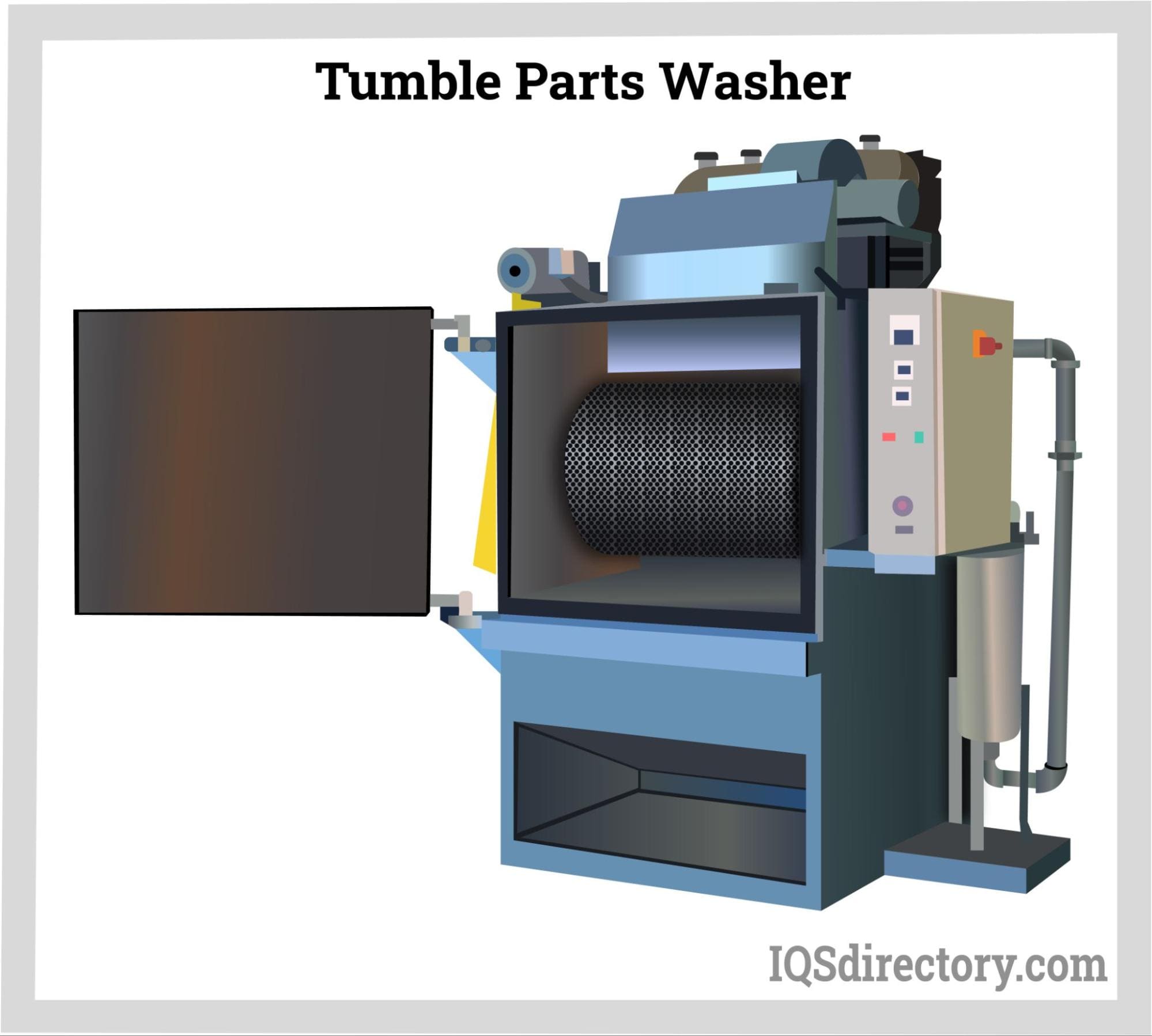 Tumble parts washers incorporate features common to other parts washing systems, such as storage tanks for recirculating water and rinse tanks. Some models also include an additional tank for heavily soiled parts needing extra cleaning. These washers can integrate multiple cleaning stages, including spraying, immersion, and ultrasonic cleaning, which can be used in any sequence to optimize the cleaning process.