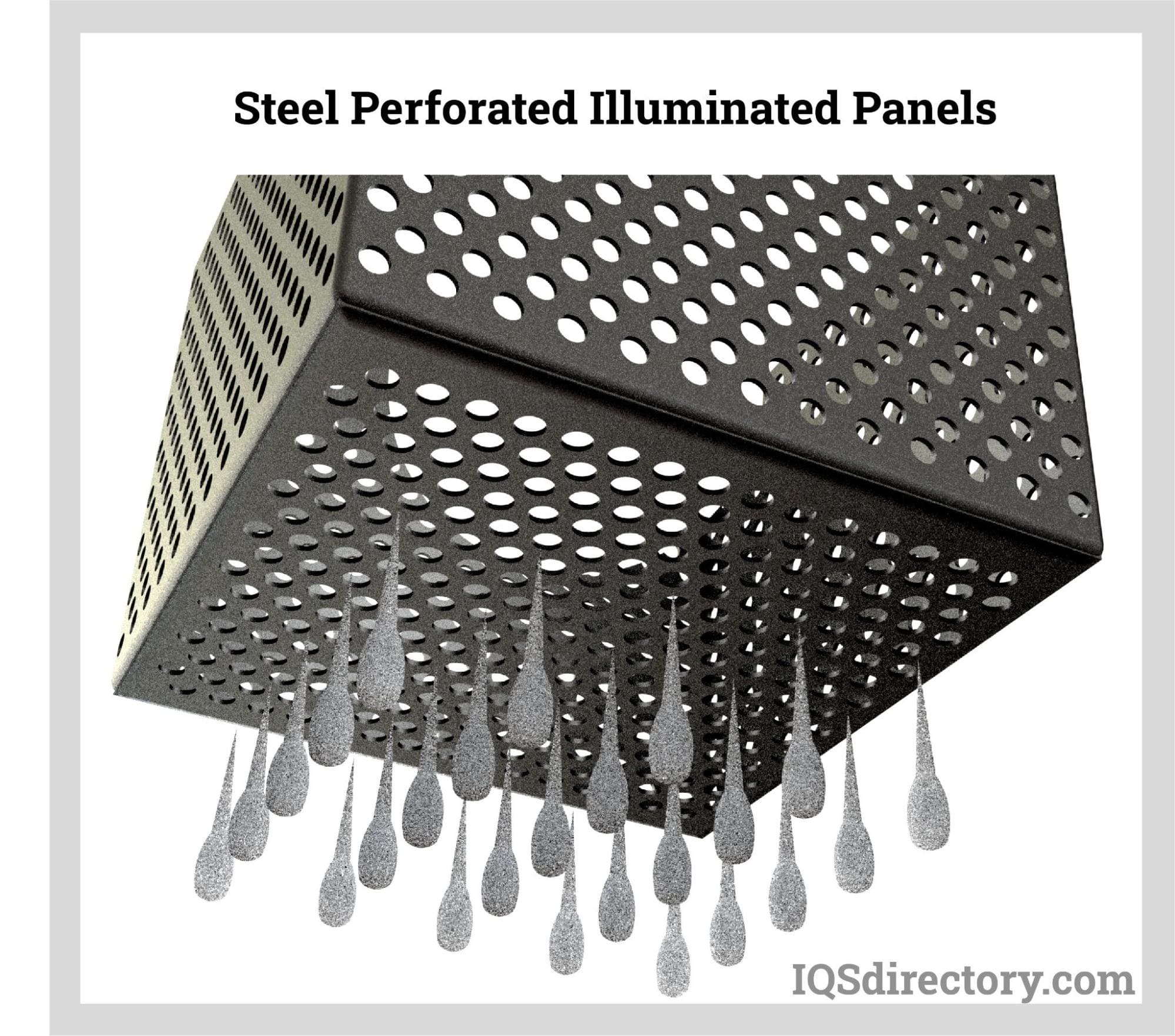 Perforated stainless steel panels feature holes or perforations and can have varying sizes of holes distributed across the entire panel or within specific panel ribs. These panels are commonly used to enhance light and ventilation, as well as to provide sound absorption. Due to these benefits, perforated stainless steel panels are often utilized in applications such as soffits, gymnasiums, equipment screens, and structures like parking garages.