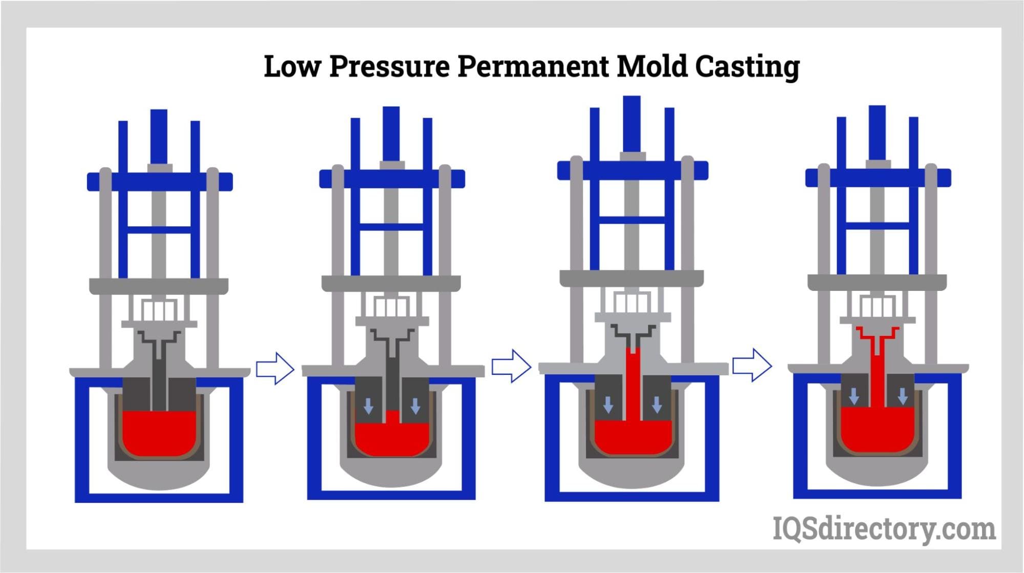 The low pressure permanent mold casting process is an advanced metal casting method that utilizes regulated air pressure, typically between 3 psi and 15 psi, to move molten metal from a furnace or reservoir upward into the mold cavity. Unlike gravity casting, where metal fills the mold under its own weight, this technique allows for accurate control of the metal flow rate, reducing turbulence and ensuring uniform mold filling.