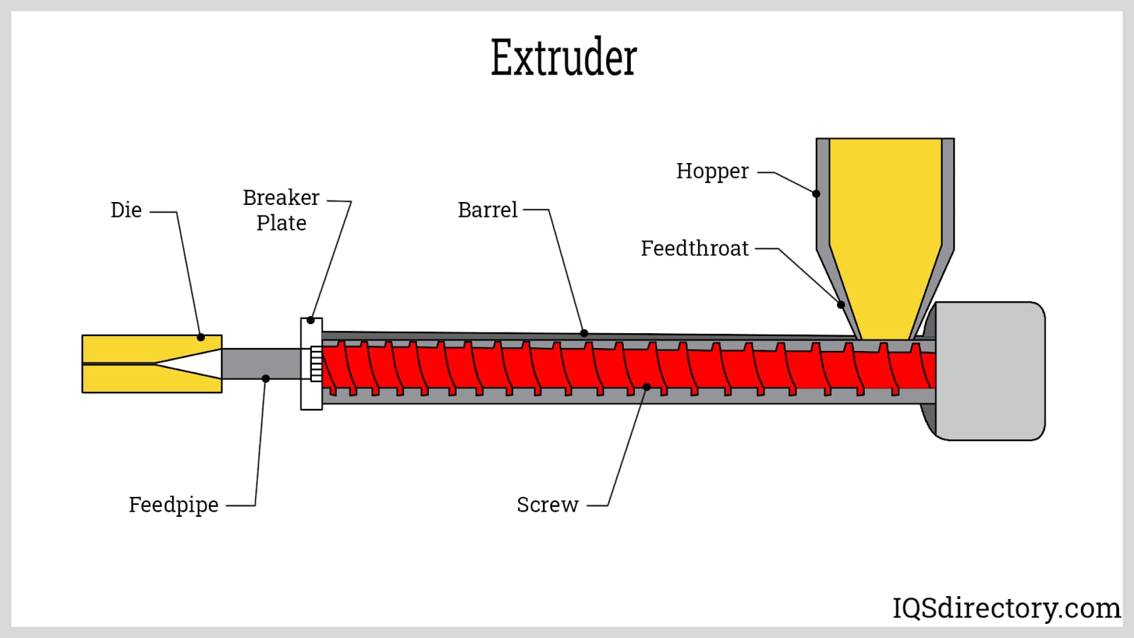 The extruder is the heating mechanism required for the production of plastic bags. It comprises a large tube called the barrel and an auger, which is a helical screw. The auger gently advances the resin pellets toward the die as they drop from the hopper into the barrel. Heating elements are positioned along the barrel on either side, gently melting the resin pellets to create the molten liquid that will reach 500°F and be pushed into the die. For the heated resin to pass through the circular die at the extruder's end, it must be sufficiently malleable. The molten plastic is driven through a spherical, circular die at the barrel's end before it enters the cooling tower. Before reaching the die, a screening or breaker plate is used to eliminate any potential contaminants to guarantee the purity of the molten resin. The breaker plate has two purposes: it cleans up debris and shields the die from the extremely high pressure that the extrusion process generates.