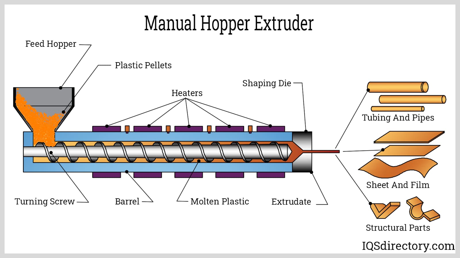 To initiate the extrusion process, plastic resin pellets are first loaded into a hopper, which is a container for holding bulk material. Positioned at the beginning of the extruder barrel, the hopper has evolved from simple cone-shaped holes that required manual loading of resin pellets. Modern hoppers now feature advanced designs and feeding mechanisms, reducing the need for manual loading.