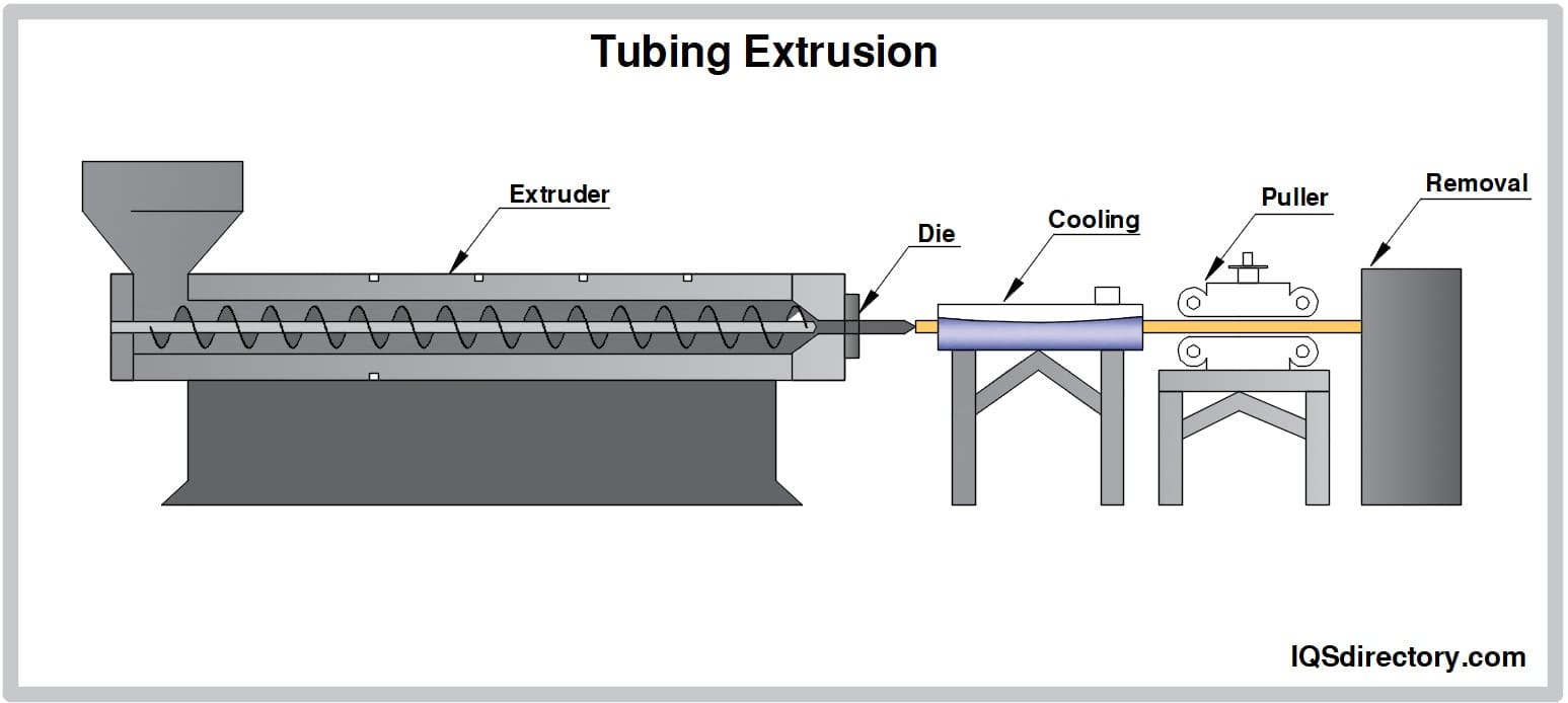 Tubing extrusion specifically produces hollow plastic parts such as pipes, tubes, hoses, and ducts. During the plastic extrusion process, the polymer melt passes through a die to create the tube shape. Positive air pressure is introduced to form the hollow center, and the extrudate is rapidly cooled—usually with water. This method enables the manufacture of both mono-lumen and multi-lumen tubes used in applications ranging from medical devices (catheters, IV tubing) and irrigation tubing to drinking straws and conduit.