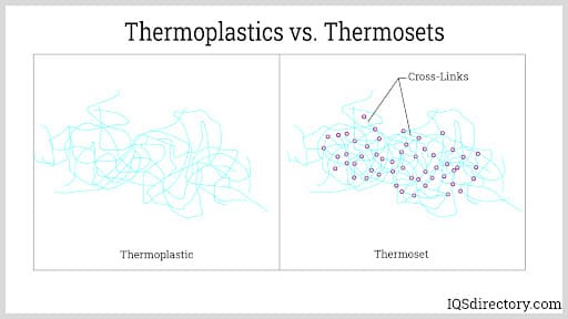Thermoset Plastics: Plastics made from thermoset polymers form cross-links between the molecules that prevents thermoset plastics from softening when heated. During manufacturing, thermoset polymers are exposed to heat, which causes the polymers to undergo a chemical reaction that permanently changes the properties of the plastic. Included in processing curing that creates crosslinks between the polymer chains, finalizing and permanently setting the properties of the plastic.