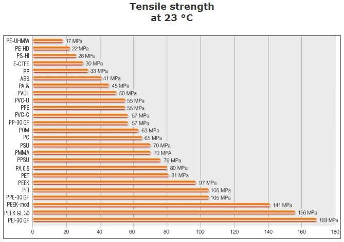 Assessing the mechanical properties of a material, including its tensile strength, is crucial when selecting the appropriate plastic. Tensile strength measures how much stress a plastic can withstand before breaking, and it varies between 12,400 psi and over 20,000 psi. The chart below provides a comprehensive list of various plastics and their tensile strength in megapascals at 73°F (23°C).