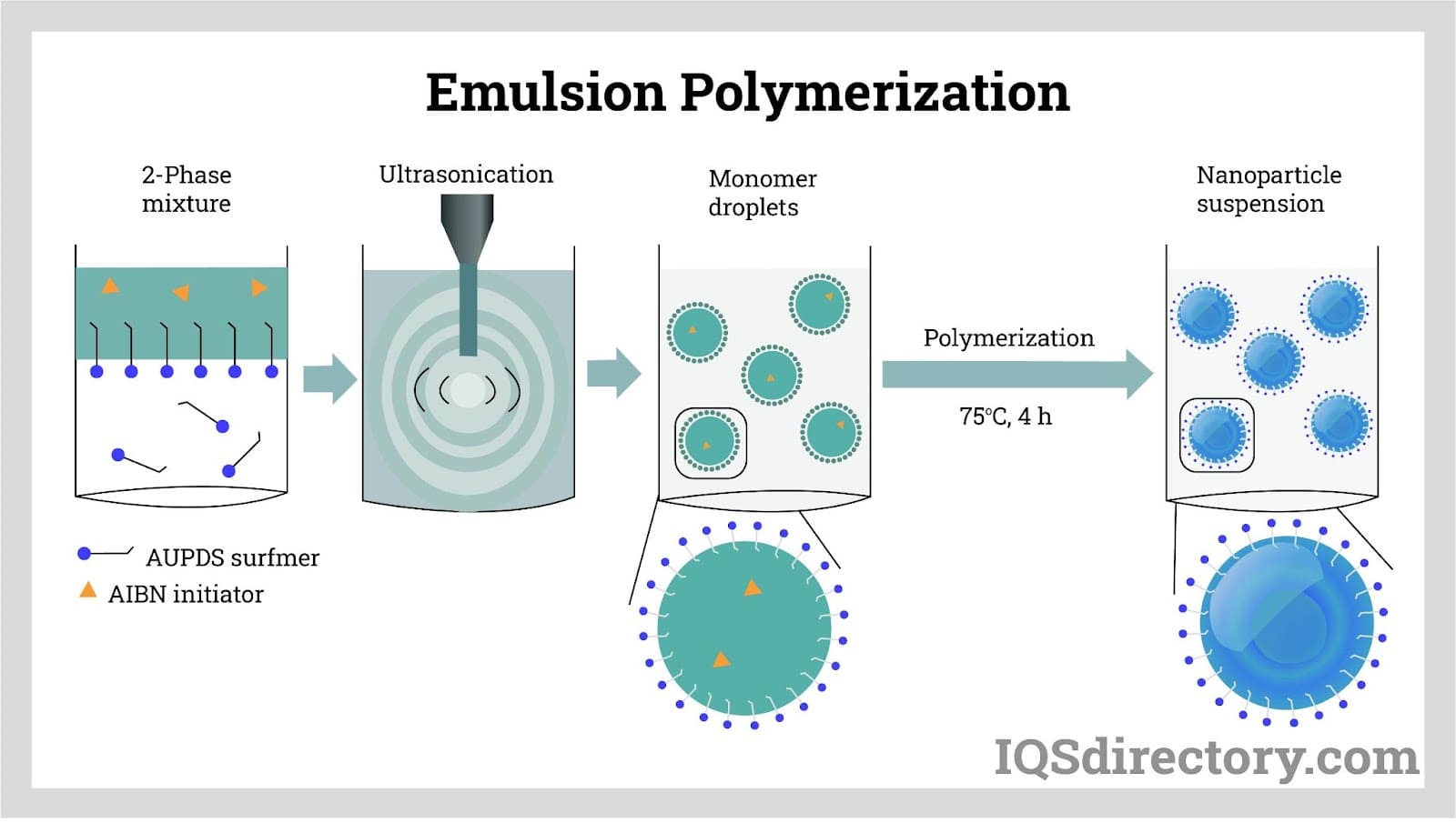 The particles eventually solidify into spherical polymers through vigorous stirring and steric stabilizers. These particles are typically several hundred micrometers in size. Suspension polymerization effectively produces polymers from highly reactive monomers via radical polymerization.