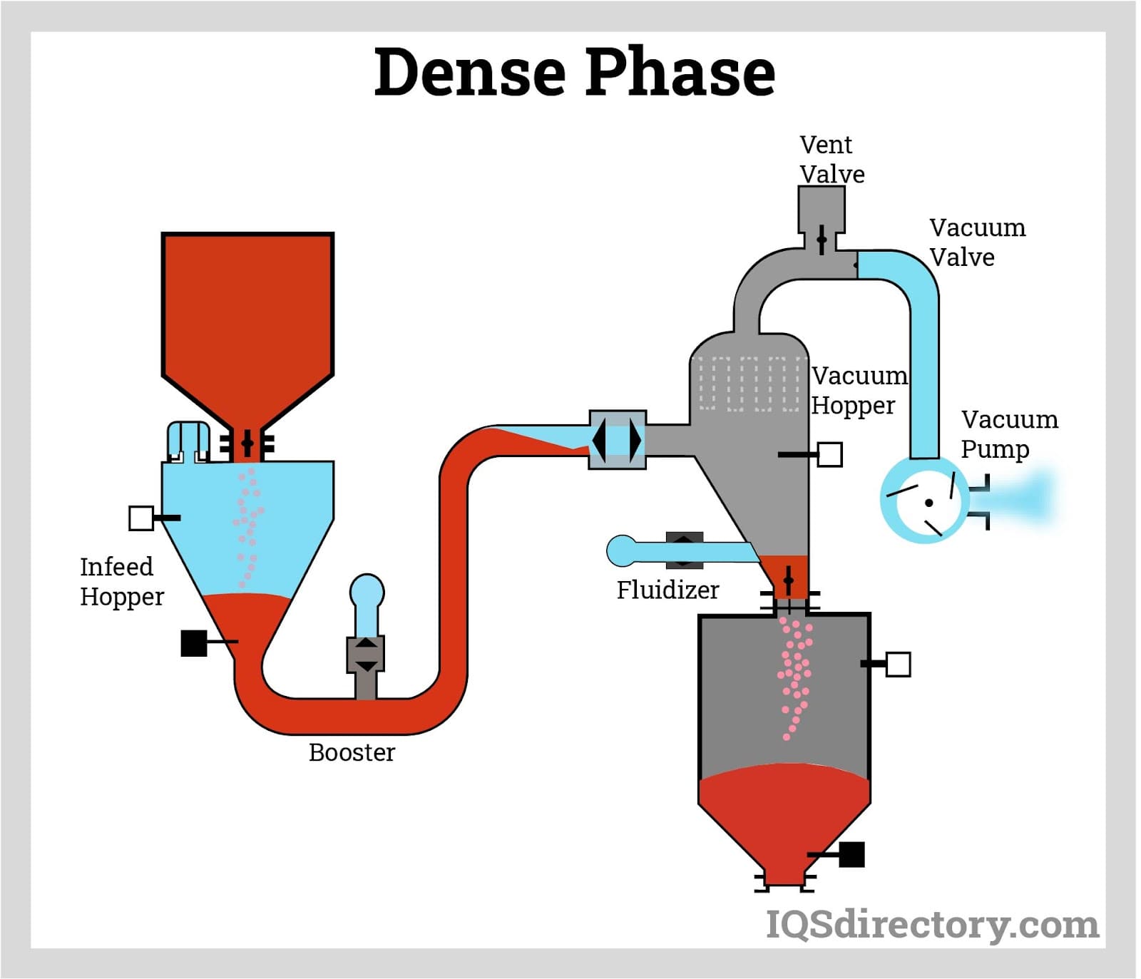 In contrast to dilute phase vacuum conveyors, these dense phase pneumatic conveyors operate at very low velocities and higher product concentrations, resulting in a slow movement of slugs or packets through the pipeline. The low-speed, high-pressure, dense phase minimizes product attrition, making it the preferred choice for fragile, abrasive, or heavy bulk materials that could be damaged in high-velocity dilute phase systems.