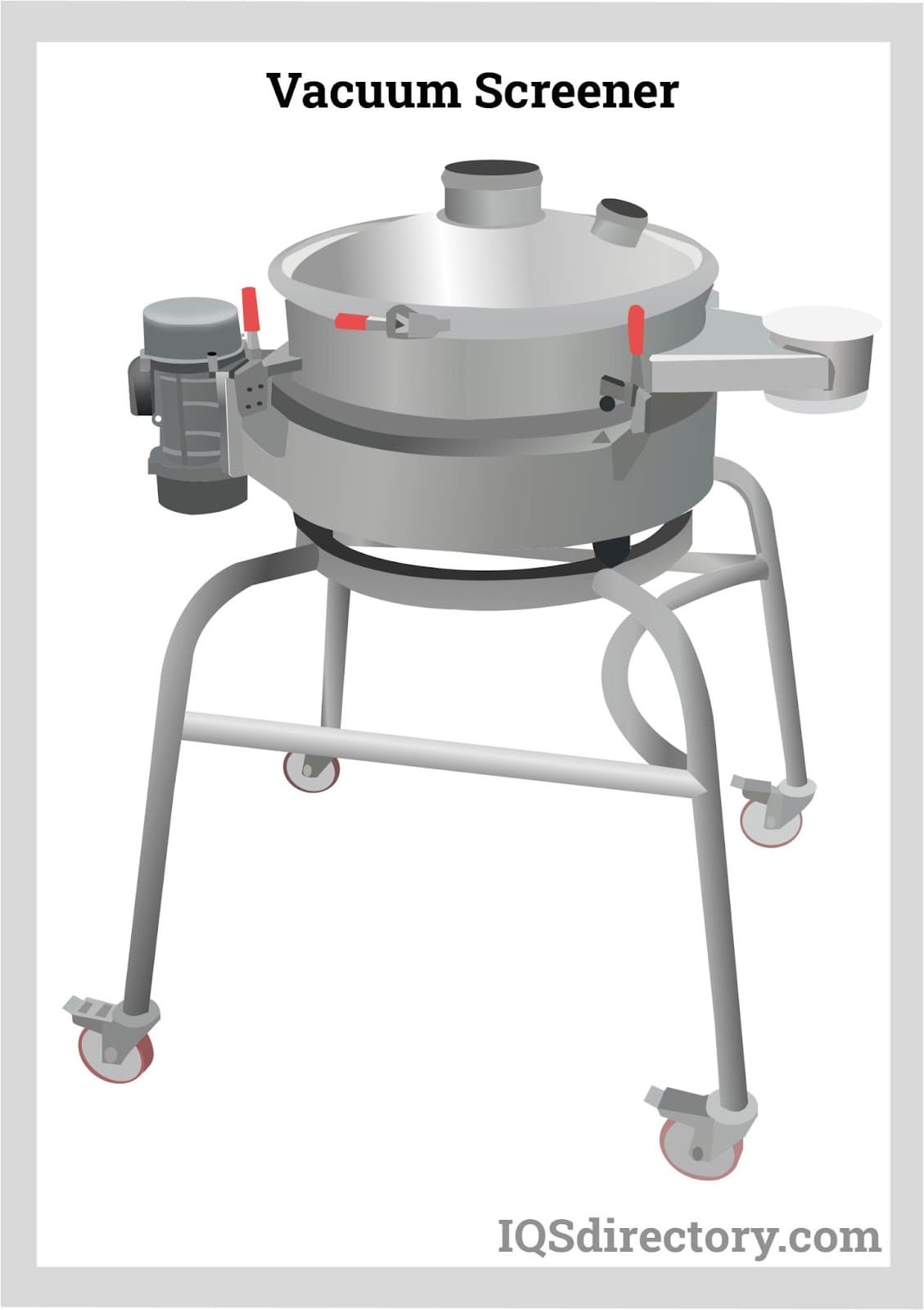 The vacuum screener, directly connected to a pneumatic transfer line, screens materials through a range of mesh sizes. Its design is particularly suited for pharmaceutical powders, food products, chemistry, and eliminating lumps and impurities from product streams. Its construction also simplifies cleaning and operation.