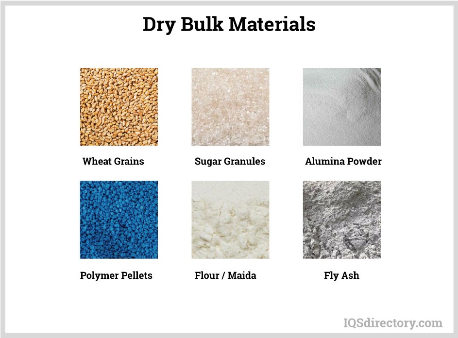 Materials transported by pneumatic conveying systems include cement, fly ash, starch, sugar, salt, sand, plastic pellets, oats, polymers, lime, soda ash, plastic resin, plastic powder, dry milk, and feed.