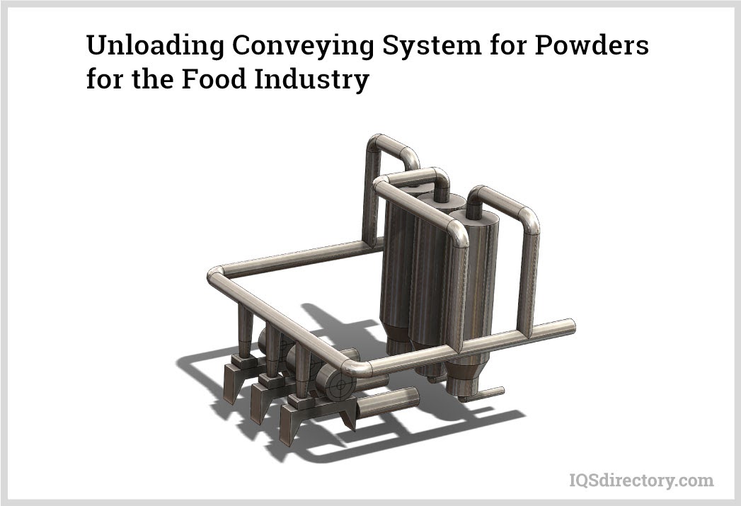 Below, the first image showcases an advanced unloading system used in food processing plants, engineered for bulk powder handling and sanitary operations. The second image features a more streamlined dry material handling system, suitable for applications involving bulk powders or granular transfer in industries such as plastics, agriculture, or construction materials.