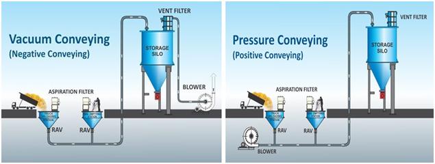 The distinction between pressure and vacuum systems is illustrated in the diagram below. In the vacuum system (shown on the left), the blower is positioned on the right with the hoppers on the left. In contrast, the pressure system (shown on the right) features the blower to the left of the feed tube, pushing the material toward the storage silo.