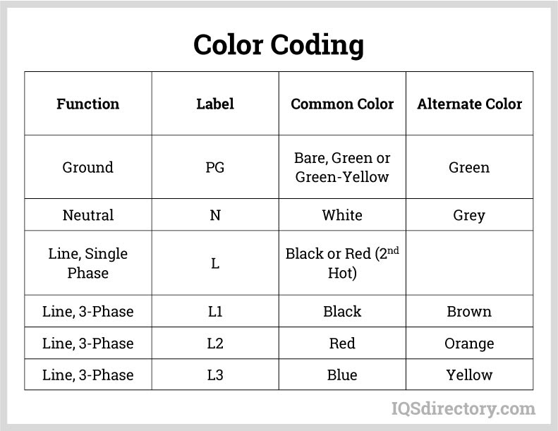 Wiring for AC and DC power is color-coded to simplify identification. The IEC provides color codes for AC branch circuits, and the chart below outlines common color codes used in the United States. However, since these codes are not standardized nationwide, variations may exist depending on the region.
