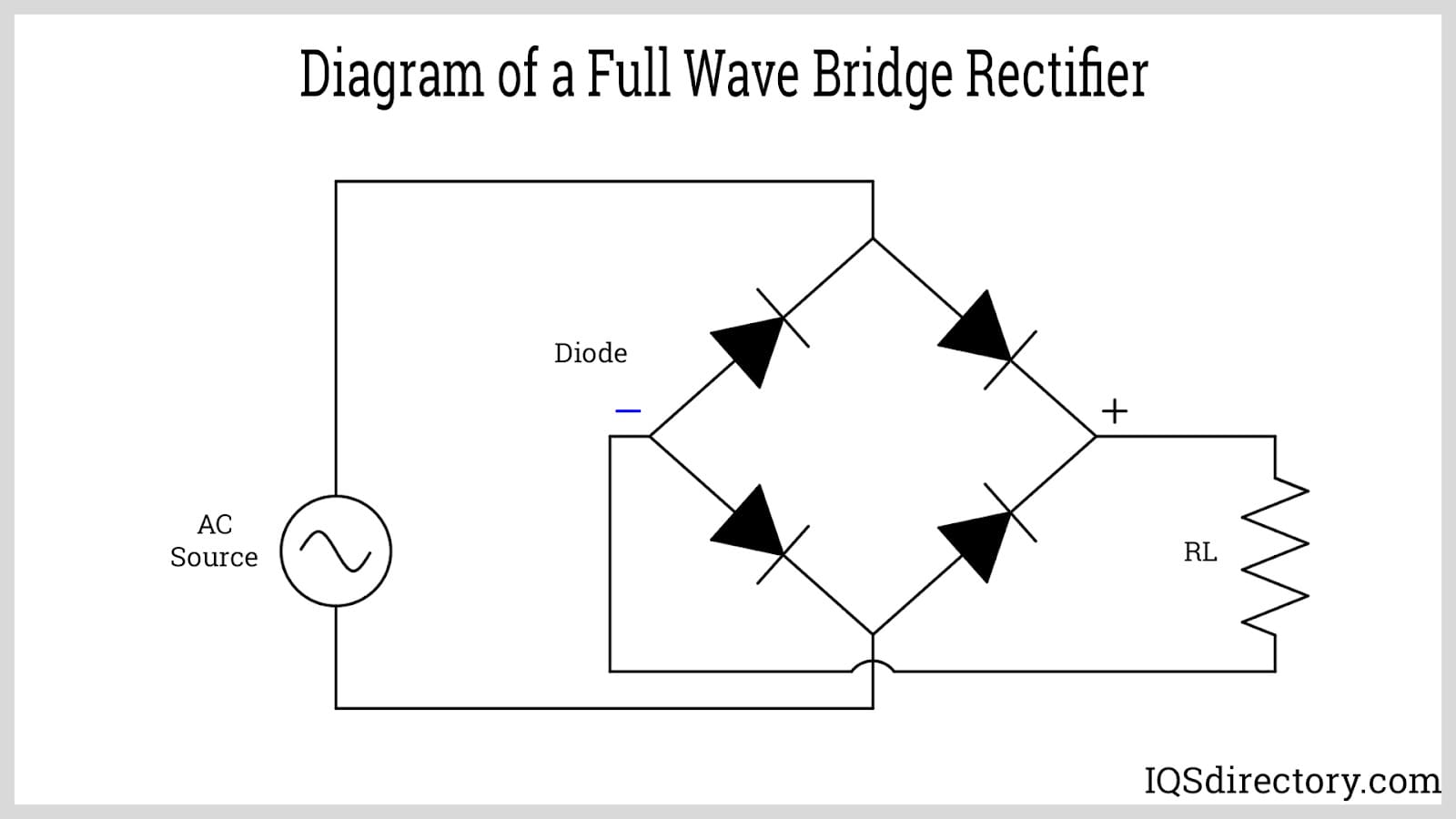 A full wave bridge rectifier has a four-diode bridge design and converts the complete AC signal into DC signal. It is the most used type of rectifier. Full wave bridge rectifiers convert positive and negative half cycles of AC current into DC current and provide double output voltage compared to half wave rectifiers, which is possible due to the four diodes.