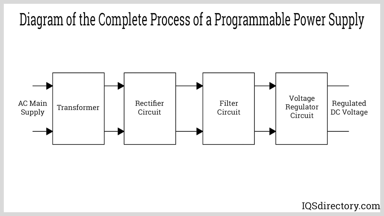 A programmable power supply enables precise control of output voltage using an analog or digital signal, which can be adjusted via a keypad or rotary switch on the device's front panel. These power supplies manage output voltage, current, and for an AC power supply, frequency control. Key components include a processor, voltage and current programming circuits, a current shunt, and a readback circuit for feedback.