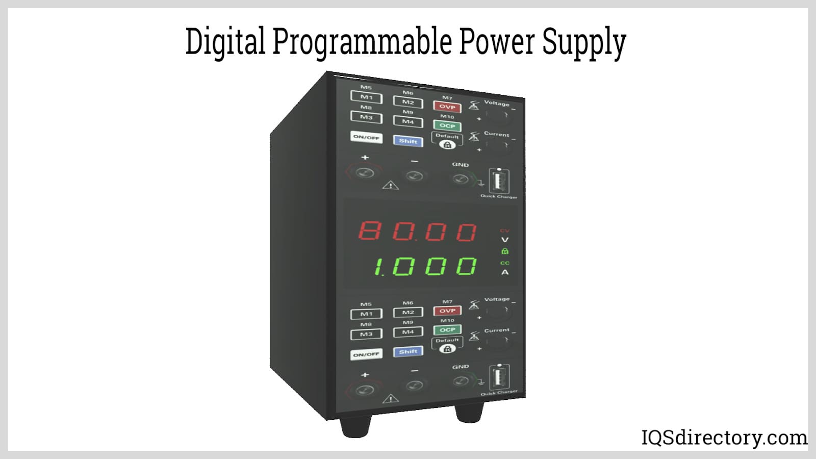 Digital programmable power supplies feature digital interfaces, microcontroller-based regulation, and encoder knobs for precise electronic control and monitoring. Programmed via front-panel inputs or remote software commands, these supplies convert digital settings into accurate voltage and current output adjustments. Advanced models offer USB, Ethernet, or SCPI-compliant control for integration with test automation and data acquisition software.
