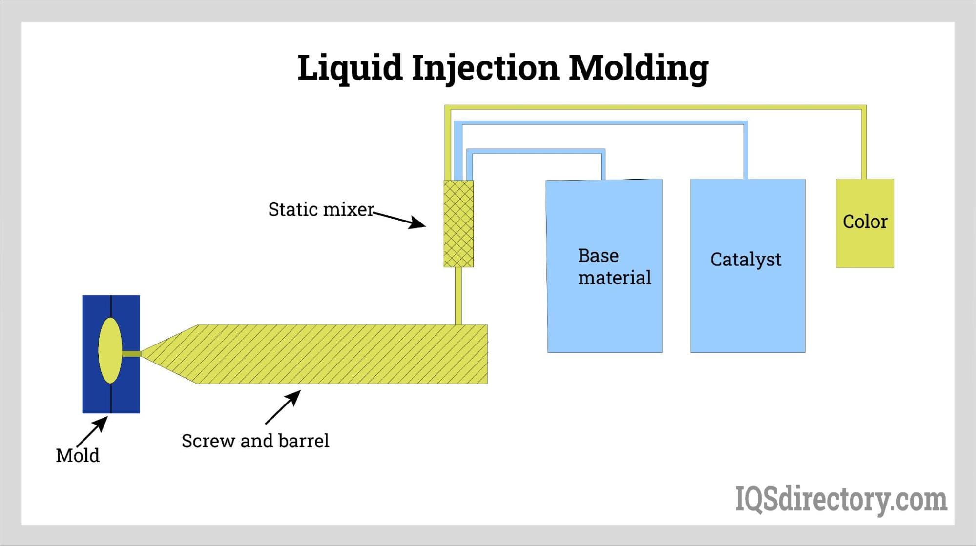 Liquid injection molding utilizes liquid silicone rubber, which is injected into the mold cavity through a nozzle. Unlike standard injection molding, liquid injection molding involves mechanically mixing the silicone rubber before injection using two plungers. One plunger holds the base material along with additives and fibers, while the other contains the catalyst compound that initiates the mixing process.