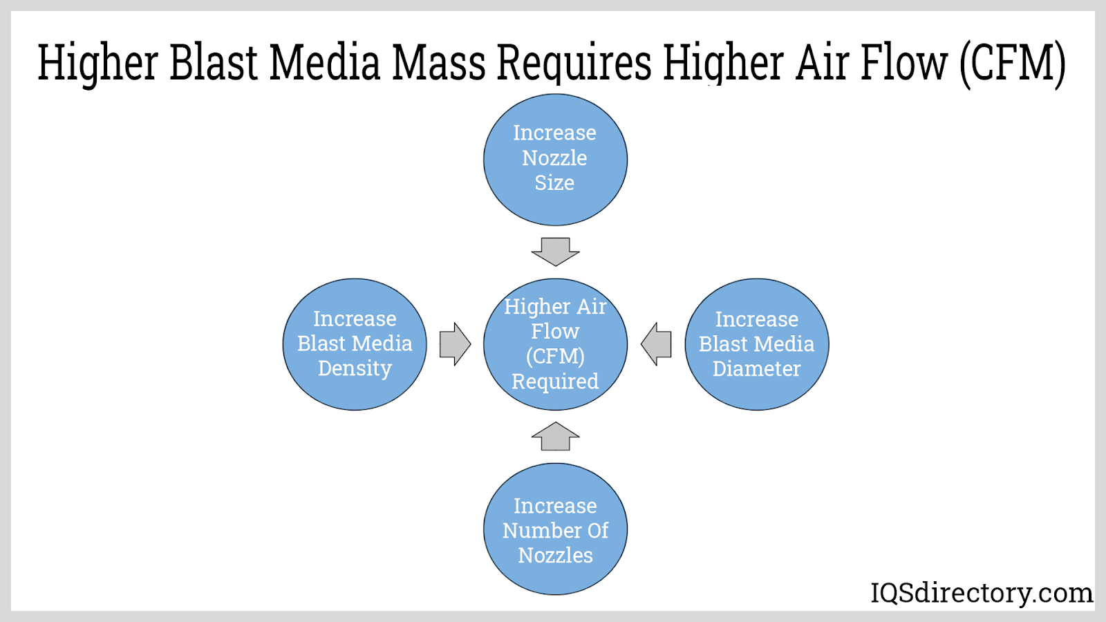Larger diameter blast nozzles, wider-pattern nozzles, or blasting with multiple nozzles requires large capacity air compressors (measured in CFM) to achieve the desired abrasive mass flow rate and blasting pressure. Suppliers often specify blast equipment based on compressor requirements, media type, production volume, and desired blast profile.