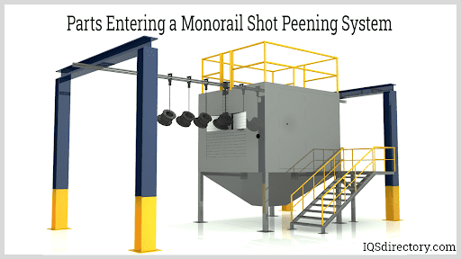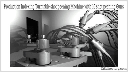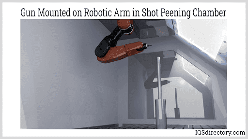 Shot peening can be automated or robotically operated to increase efficiency and quality. Shot peening can be easier to automate compared to part cleaning and finishing with grinding wheels, rotary files, and abrasive flap wheels.