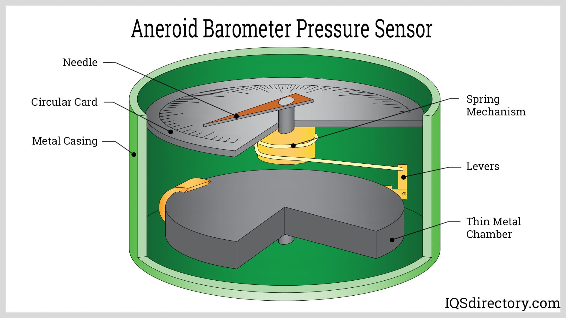 As the vacuum chamber expands or contracts, it moves the lever that turns a spring attached to the needle to register the pressure reading. The accuracy of the readings provided are dependent on the size of the chamber with larger chambers providing more accurate readings.