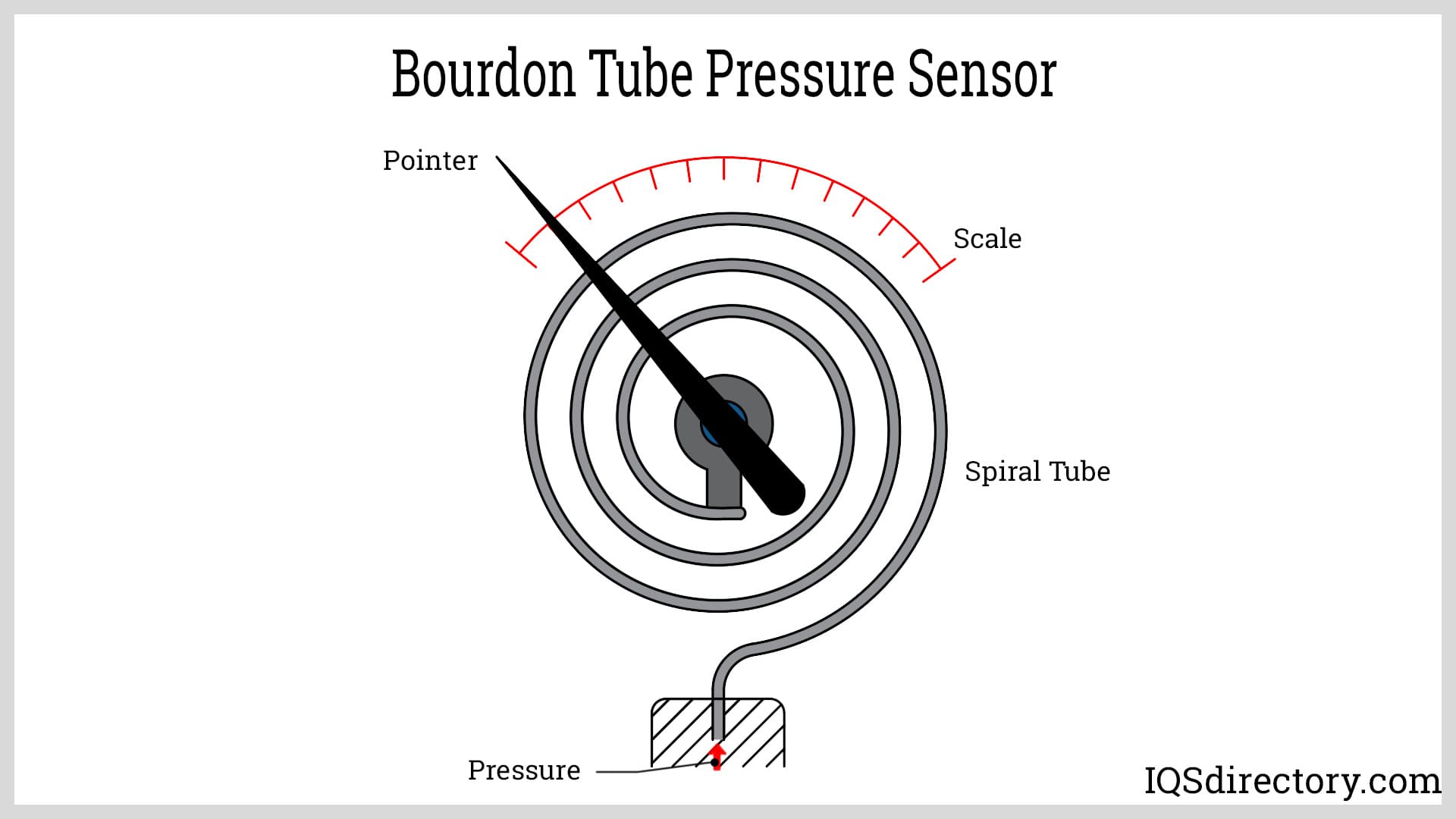 Bourdon tube pressure sensors are a form of mechanical pressure sensor that uses a C- shaped spiral tube as a sensing element. The physical movement of the tube moves a pointer along a scale that is attached to the closed end of the tube. Numerical values indicated by the pointer are the level of pressure being applied. Pressure to be measured enters the tube at its open end. As the amount of pressure increases, the tube uncoils and begins to straighten until the pressure reaches the tube's level of elastic resistance.