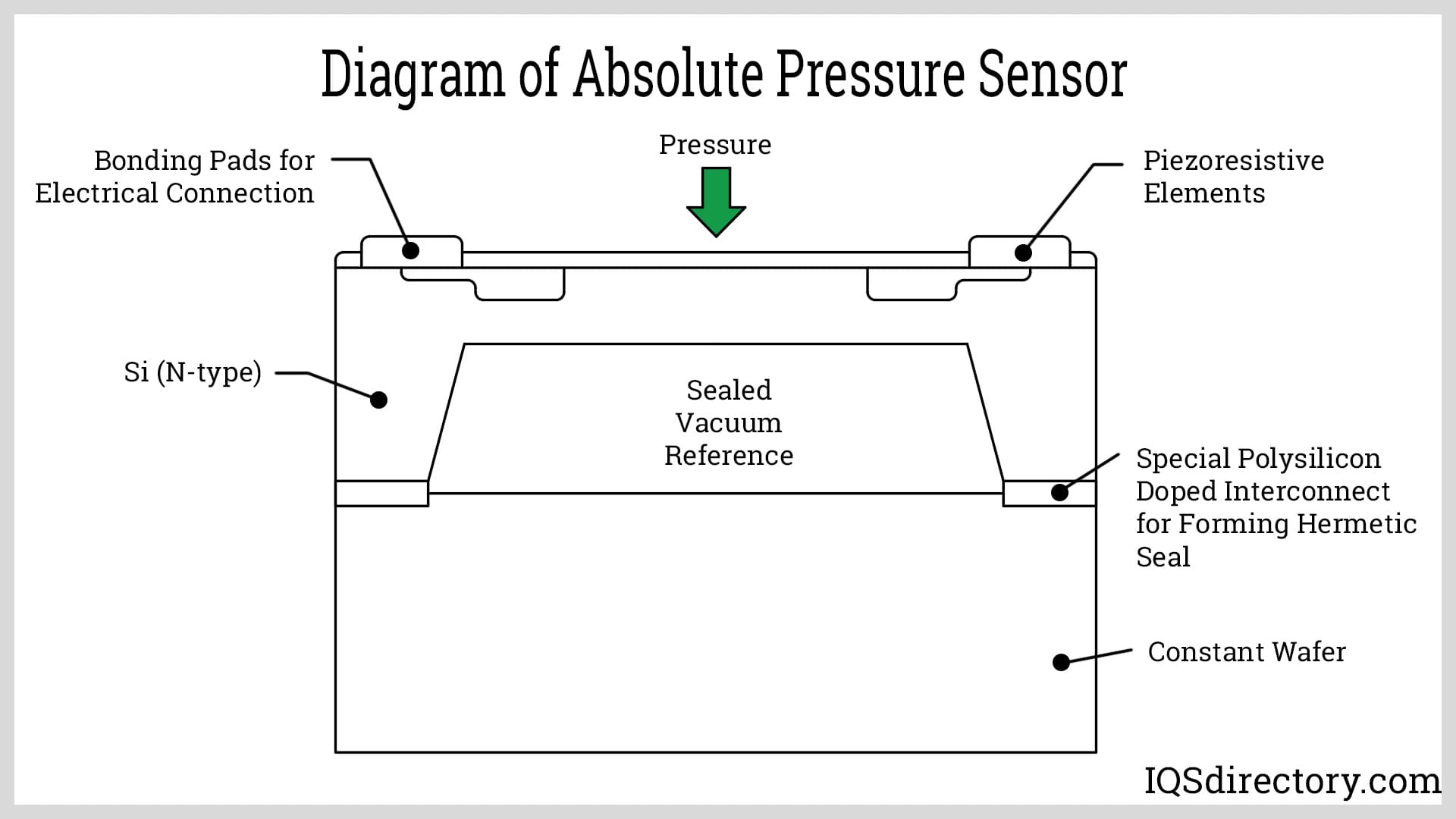 Absolute pressure measurement is made by comparing the target pressure to the known pressure of an absolute vacuum. Using a vacuum makes all measurements larger than the reference. Boyle’s Law states that the pressure of a gas is inversely proportional to its volume, at a constant temperature. Thus, the measurement of an absolute pressure sensor varies in accordance with the temperature.