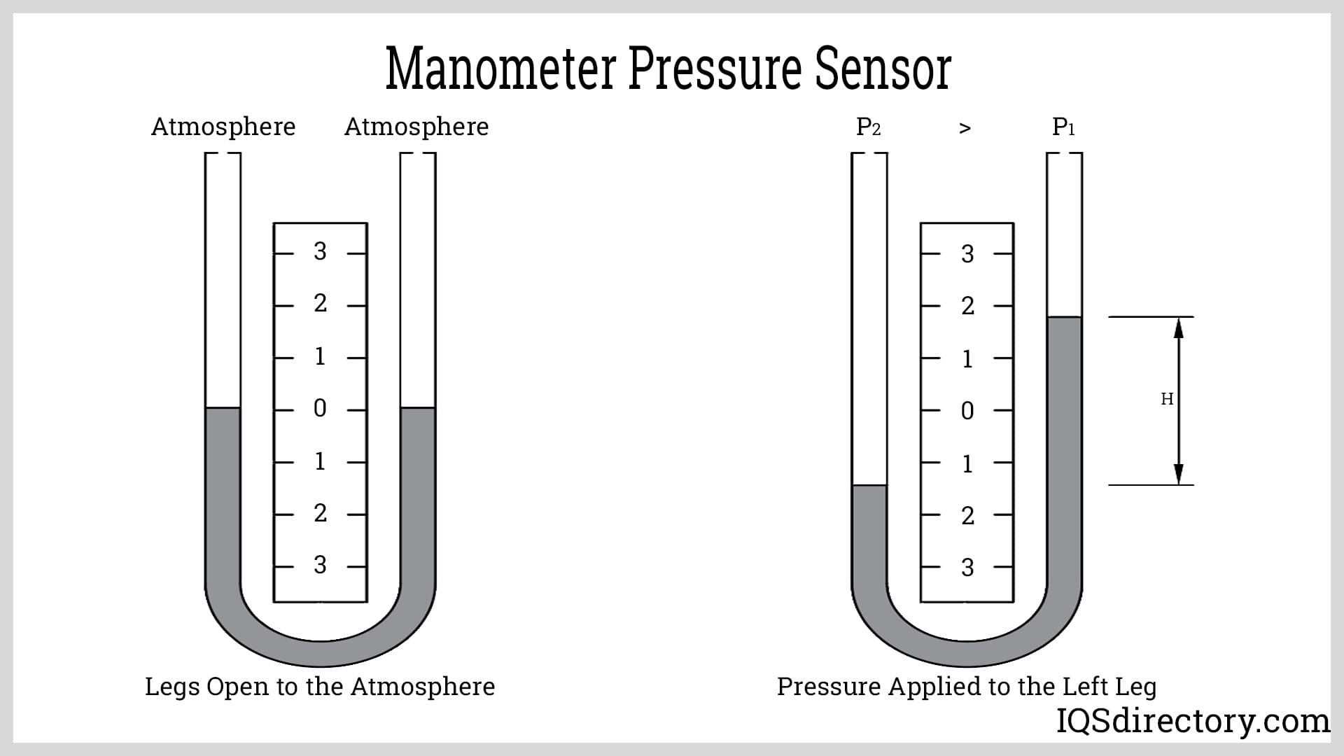Manometer pressure sensors operate on the principle of liquid displacement using a U-shaped tube. As pressure is applied to one end of the tube, liquid in the other end of the tube moves. The difference between the levels in the two ends is a measurement of the applied pressure. Manometer pressure sensors are one of the oldest forms of pressure meters. They are a simplistic form of pressure sensor and provide moderately accurate readings, which are influenced by temperature fluctuations, the readability of the scale, and the type of liquid in the tube. Manometer pressure sensors are used in low to medium pressure applications.
