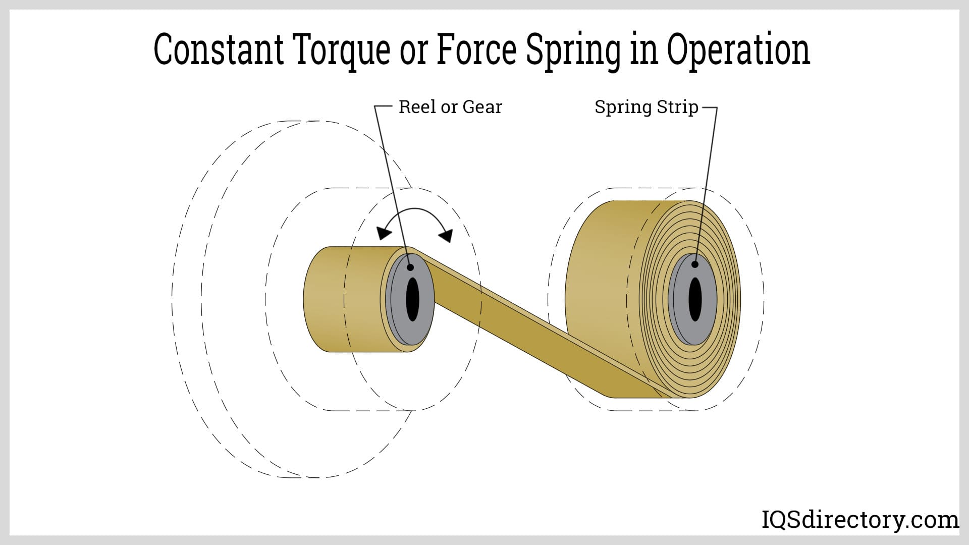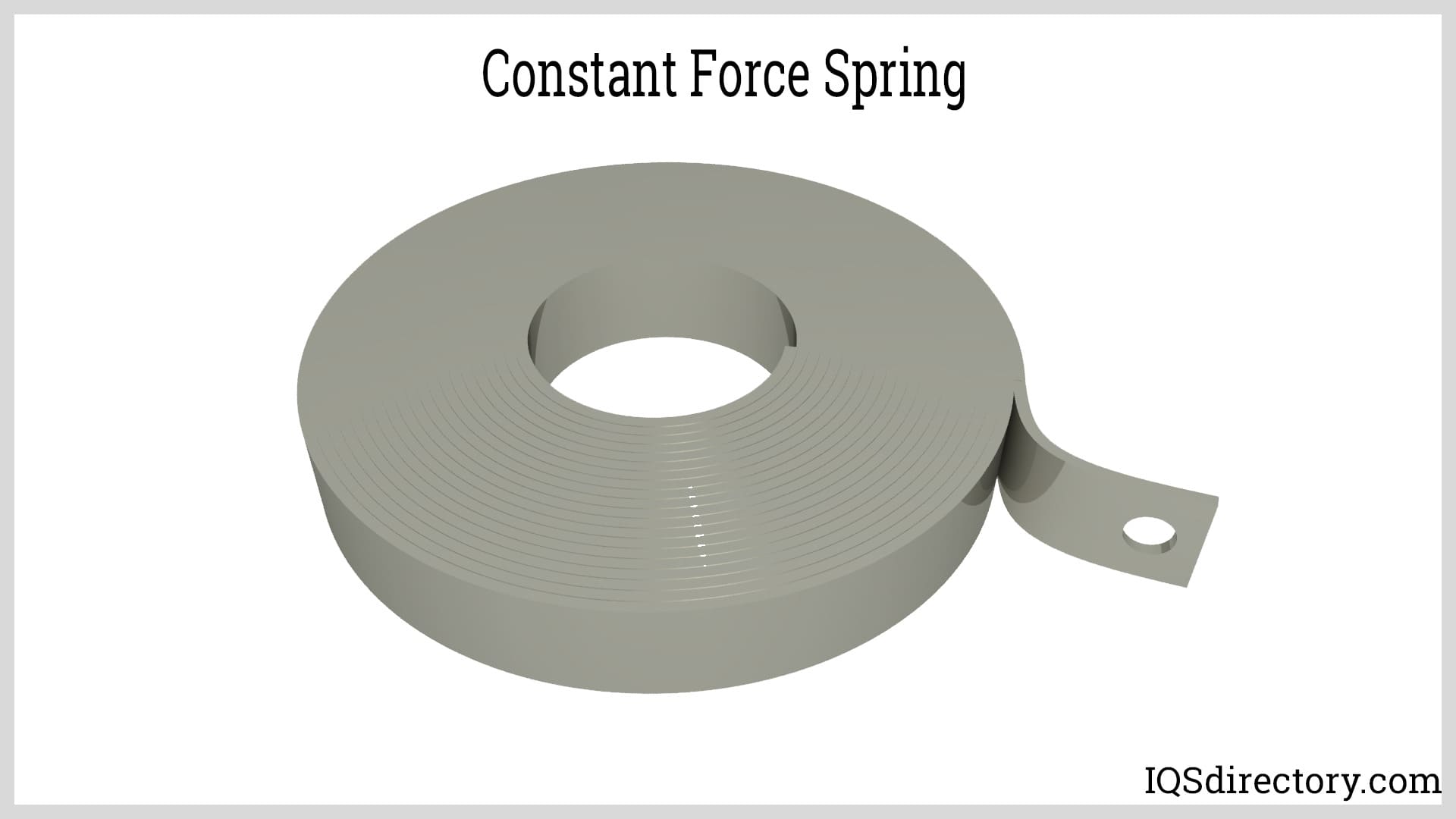 Constant force springs are tightly wound and can be extended to any length. Once a load is lifted, they immediately pull back. They are compact and can extend to pull items in a linear direction. A certain amount of the coil of a constant force spring has to remain on a shaft to hold the spring in place.