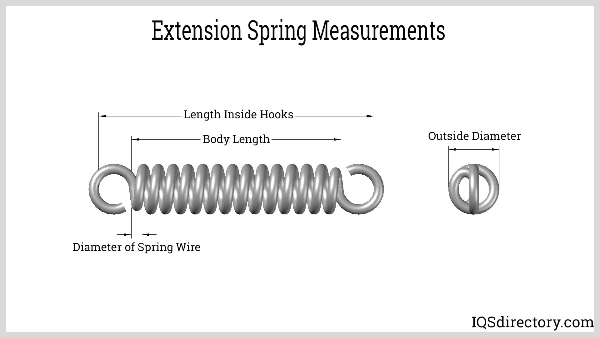 Wire diameter, outer diameter of a coil, and inner diameter of a coil are standard design features of all forms of extension springs, stock or industrial. The inside length of the hooks, which is unique to extension springs, determines how an extension spring will make contact with an assembly and whether it will fit into the designated space.