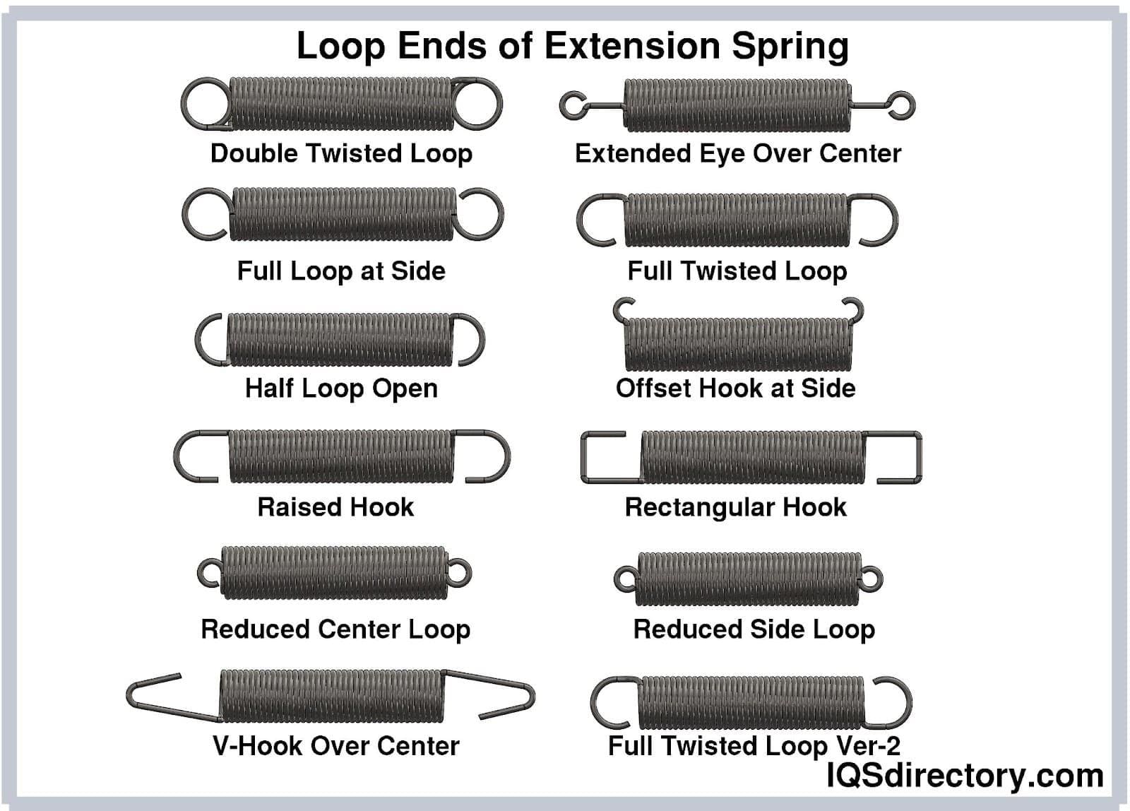 Since extension springs attach to industrial components, the types of ends for extension springs are carefully chosen to meet the requirements of an assembly. The most common type of extension spring end is a hook or loop that allows the spring to latch onto a fixture, rod, bar, or round pipe. Unlike stock springs, the ends for industrial springs are custom designed to match the requirements of a load, which necessitates that ends vary in strength, durability, and meet the application needs.