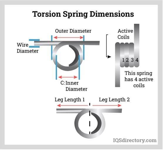With industrial torsional springs, the end legs of torsion springs are custom designed. Aside from the types of legs, the angles of torsion spring legs vary and include legs that are axial and tangential. In both cases, the angles of the legs vary from 0° up to 315° depending on the design of the torsion spring.