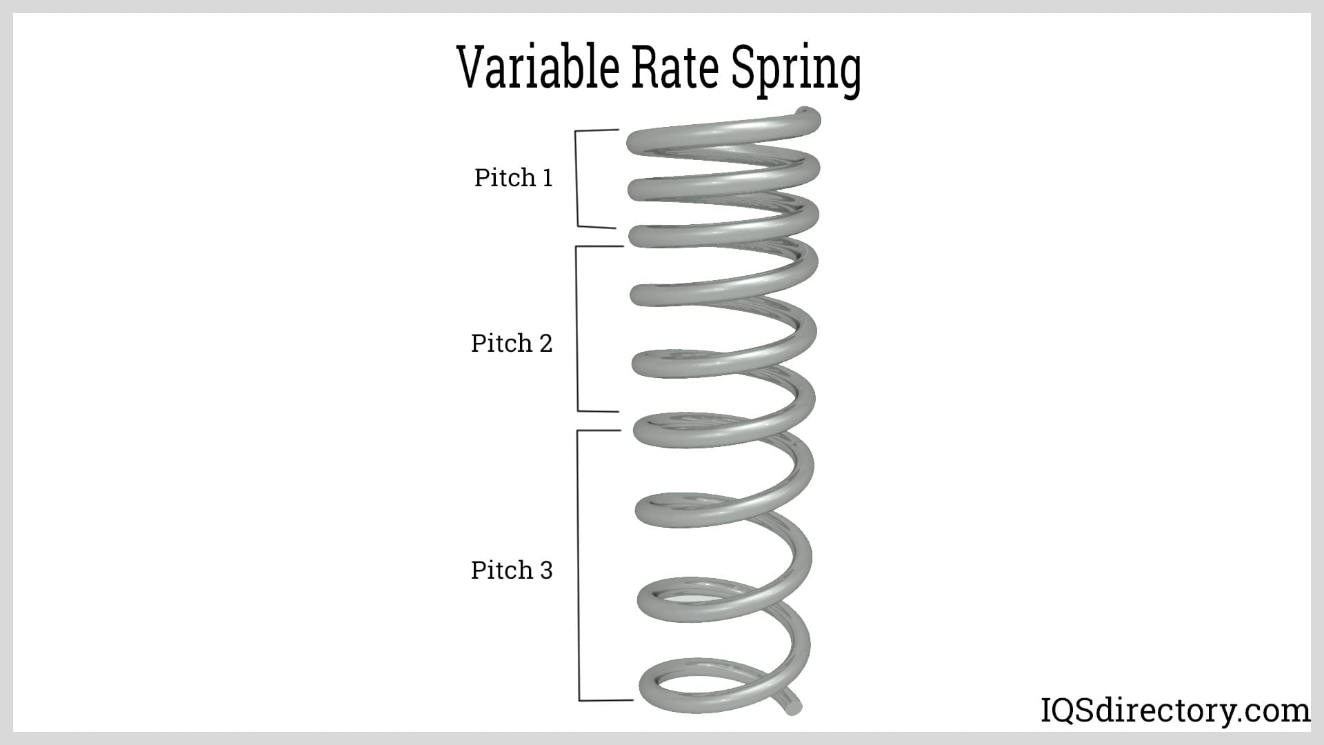 Variable rate springs, also known as progressive springs, have uneven spaces between their coils, a factor that differentiates them from linear springs. Linear springs compress one inch for every pound of applied load due to their consistent diameters and lengths. A spring with a 200 pound per inch linear rate will travel three inches when a 600-pound load is applied.