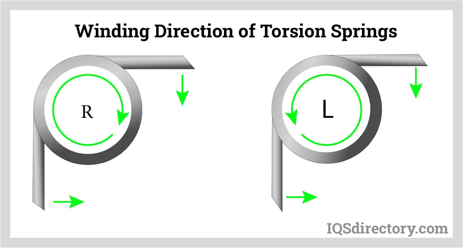 In a right-hand wound torsion spring, the back leg will torque clockwise while the front leg torques counterclockwise. For left-hand wound torsion springs, this is reversed: the back leg will travel counterclockwise, and the front leg will move clockwise.