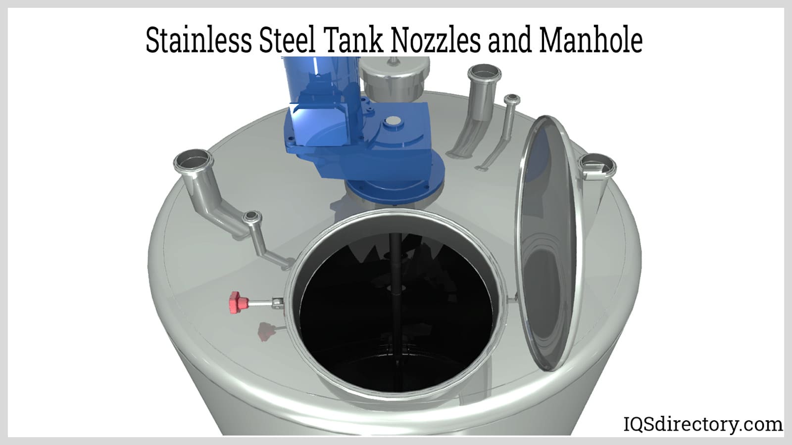 Nozzles are stub-in connections welded into the stainless steel tank for joining, coupling, or bolting inlet, outlet, and instrument pipes. Manholes provide access to tank internals for cleaning and maintenance. Nozzle and manhole sizes are usually specified by the process owner.