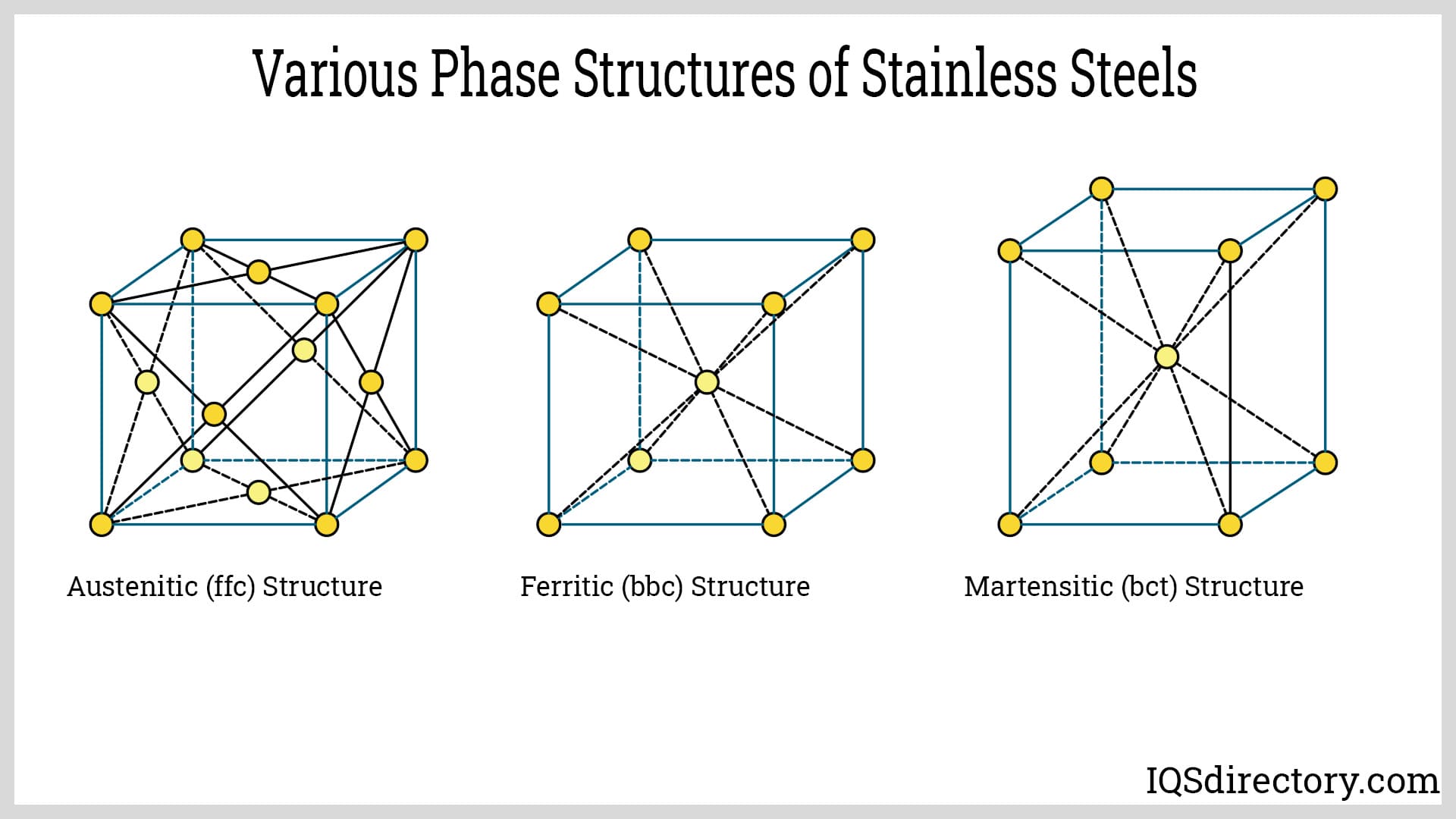 During the solidification of stainless steel alloys during production, the atoms arrange into distinct crystal structures—phases—which influence the steel's hardness, flexibility, and performance under stress. The austenite phase is characterized by a face-centered cubic (fcc) structure, providing high ductility and non-magnetic properties. The ferrite phase has a body-centered cubic (bcc) structure, resulting in higher magnetic permeability and resistance to chloride-induced stress corrosion cracking. Martensite, with its body-centered tetragonal (bct) structure, delivers superior hardness and is widely employed for cutting and wear-resistant tools. These phases are fundamental to differentiating stainless steel grades for specialized uses.